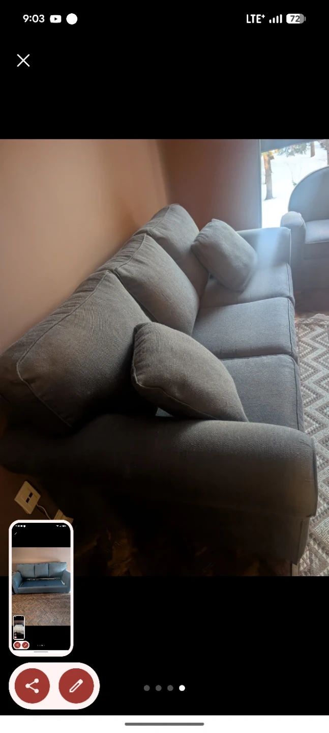 This is a grey sofa that converts into a bed. It has three seat cushions and a pull-out mattress base. The fabric appears to be a durable weave and additional a chair Sofa. All together on move out sale .
