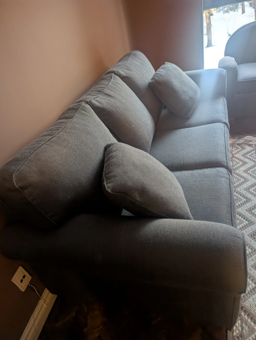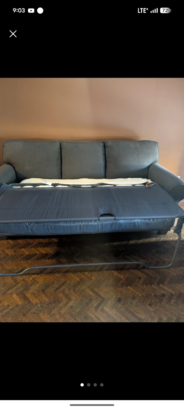 This is a grey sofa that converts into a bed. It has three seat cushions and a pull-out mattress base. The fabric appears to be a durable weave and additional a chair Sofa. All together on move out sale .