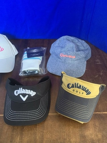 This is a great golf accessory bundle featuring premium brands Callaway and TaylorMade. Perfect for golfers looking to upgrade their gear, rotate different styles on the course, or add quality golf apparel at a great value. All hats and visors are adjustable sizes and are in excellent condition. The Callaway vintage headcover is brand new and still sealed in the original packaging.