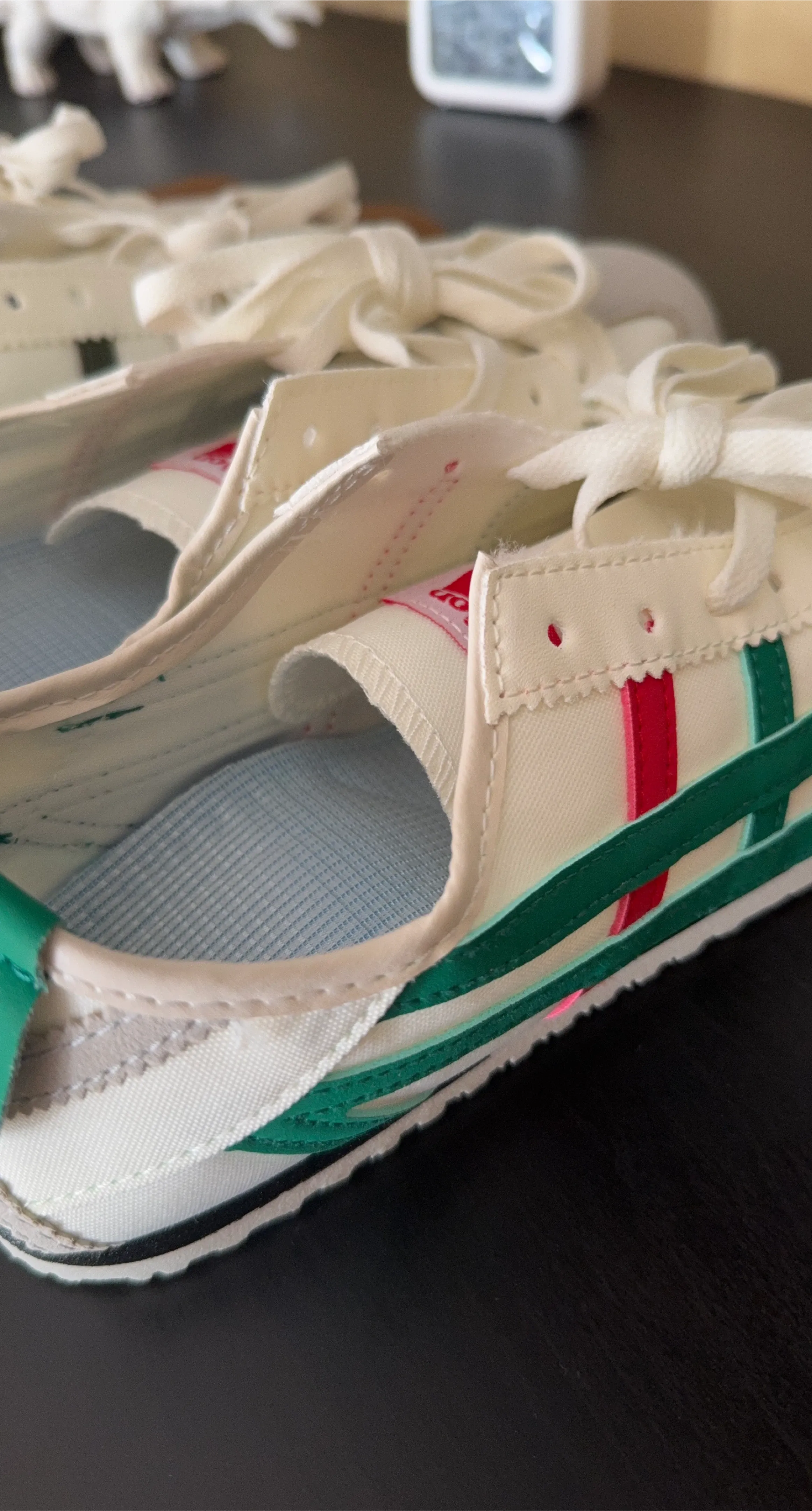 These cream canvas shoes feature eye-catching green and red stripes. They're lightweight with classic lace-up closures. The blue patterned insoles offer a bit of extra comfort. These low-top sneakers are suitable for casual wear.