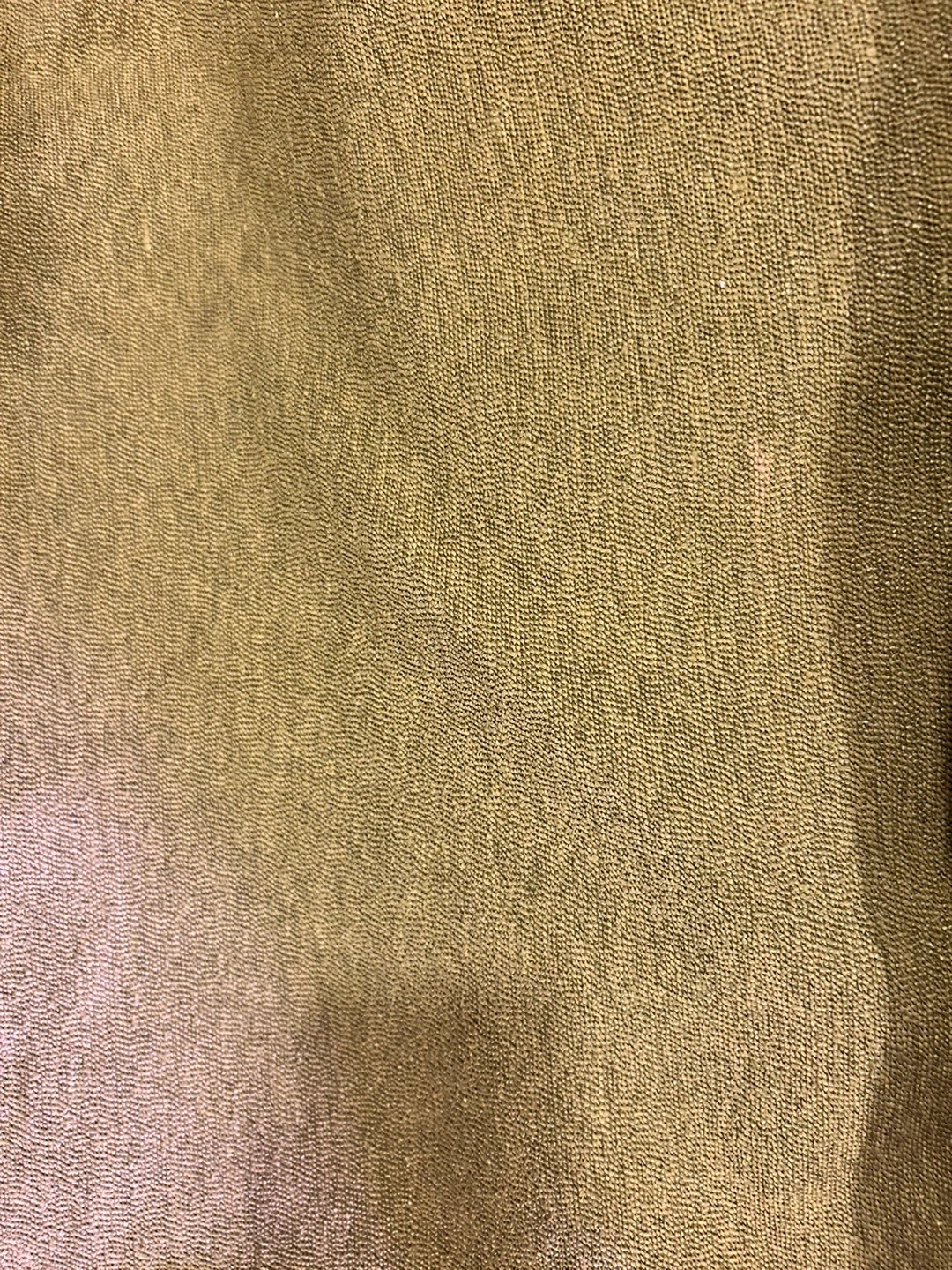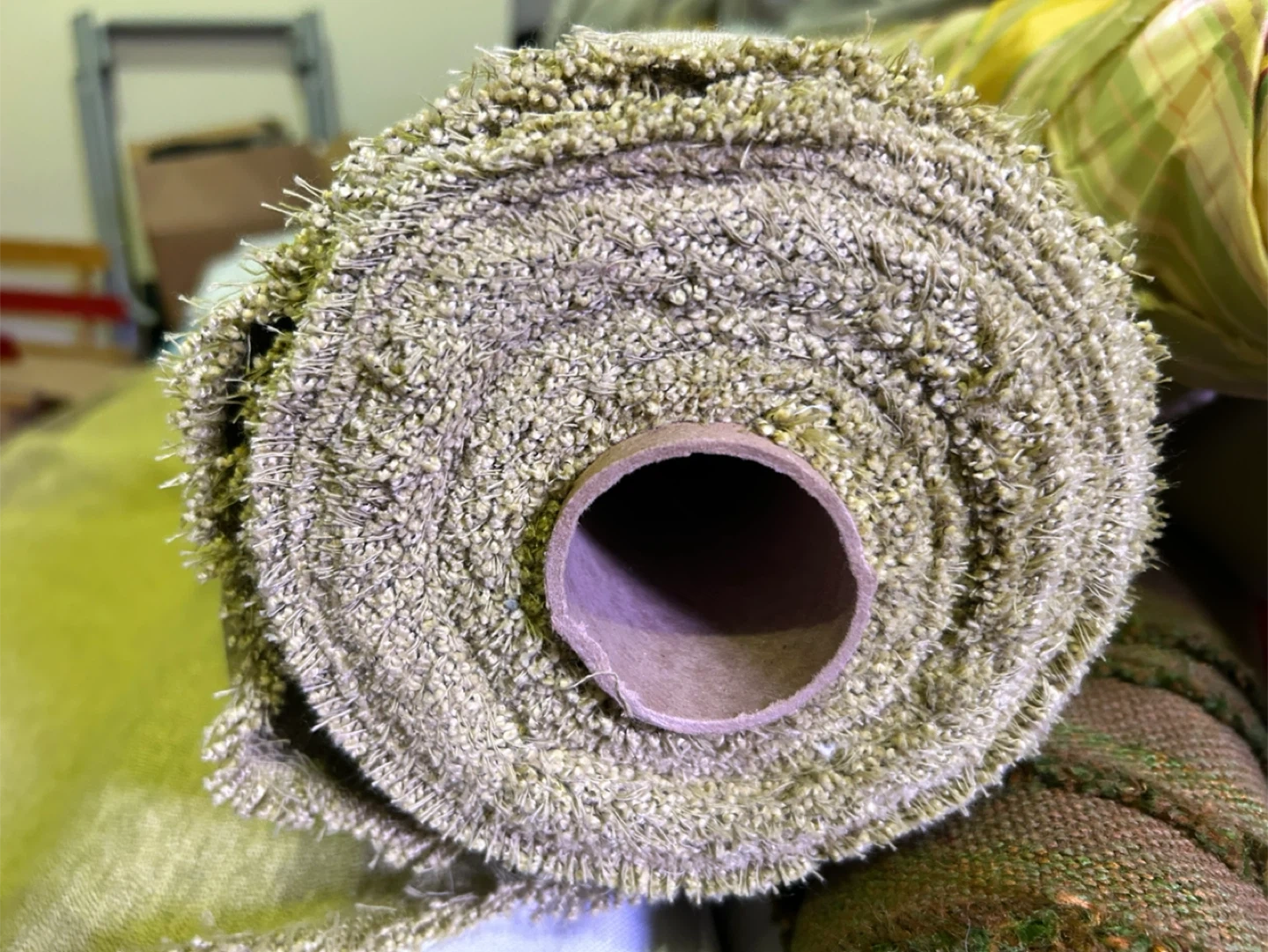 This is a roll of textured fabric. It has a fuzzy, shaggy appearance on one side and a smoother weave on the other. The colour is a muted green.