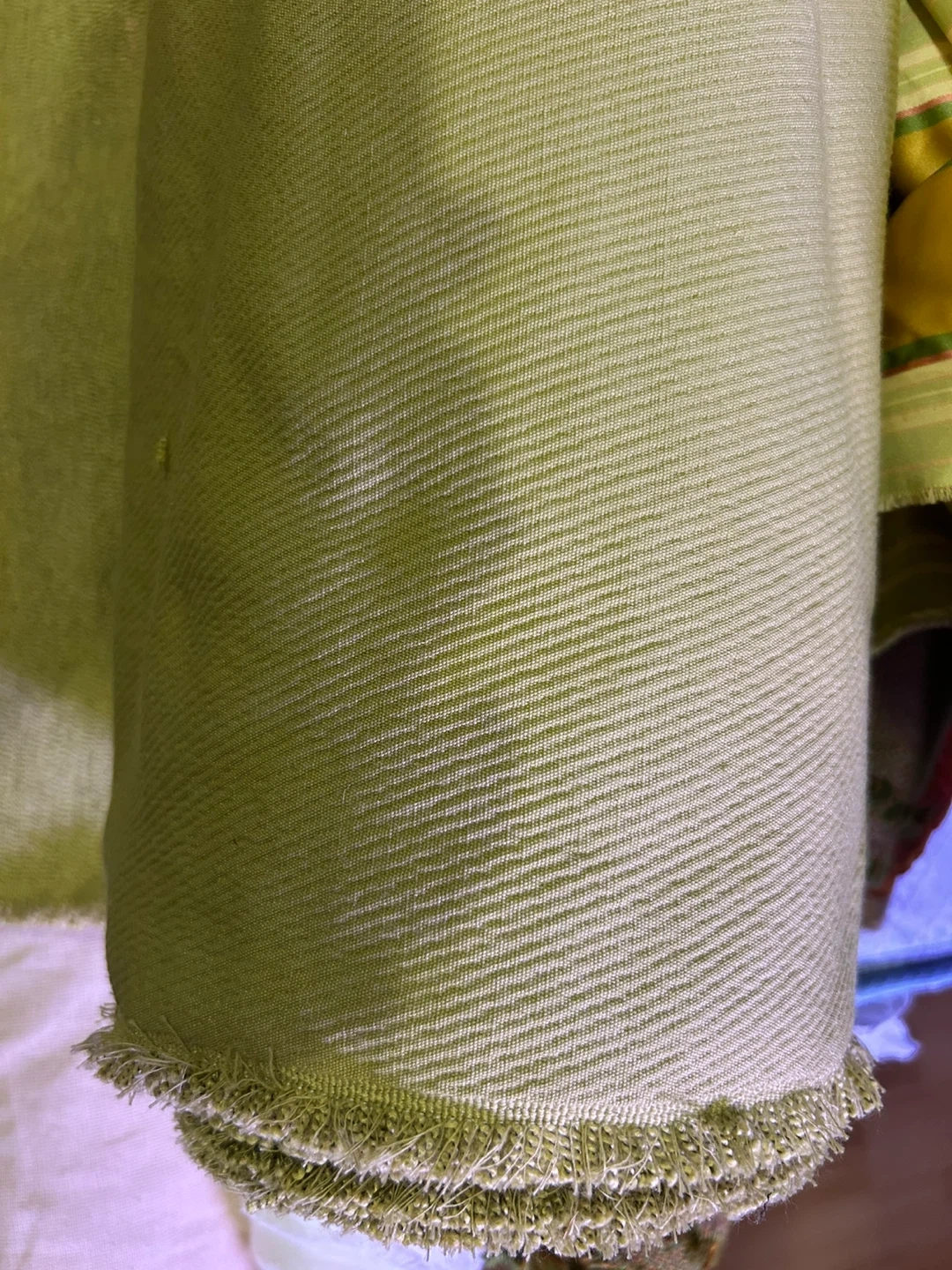 This is a roll of textured fabric. It has a fuzzy, shaggy appearance on one side and a smoother weave on the other. The colour is a muted green.
