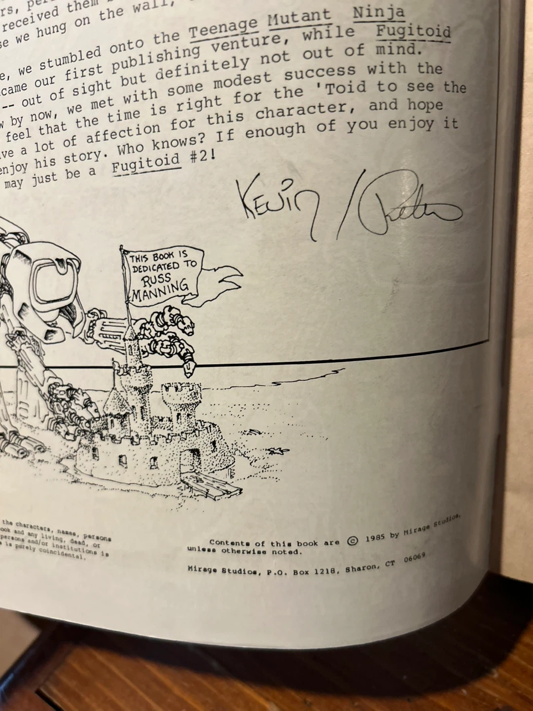 This is Fugitoid #2 from Mirage Studios, copyrighted in 1985. It features the character Fugitoid and the Teenage Mutant Ninja Turtles. The comic is in black and white. This edition is dedicated to Russ Manning. It was printed in the USA.