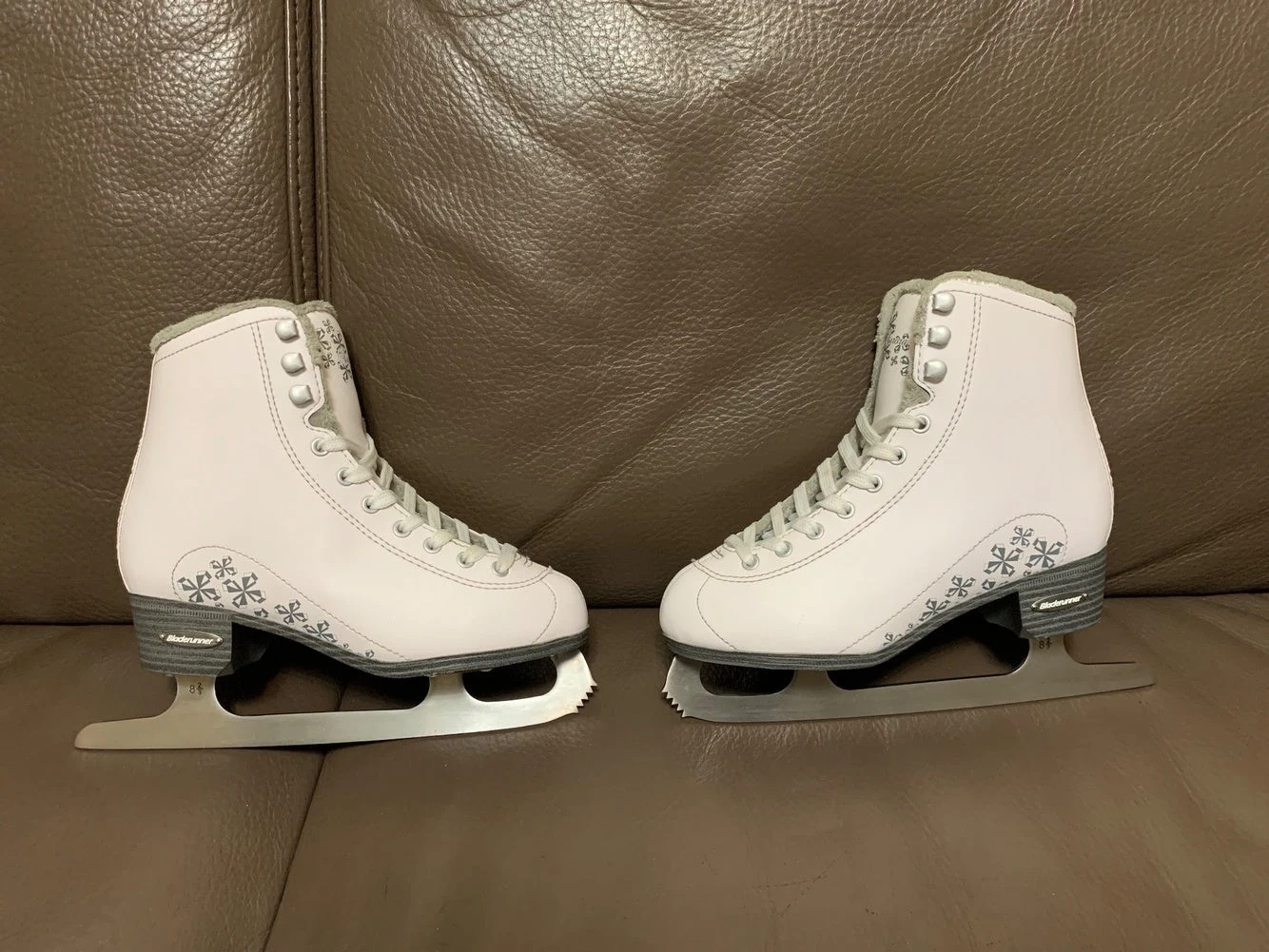 White women's ice skates with a supportive boot and comfortable lining. Features a patterned design on the side and durable blades. Perfect for recreational skating!