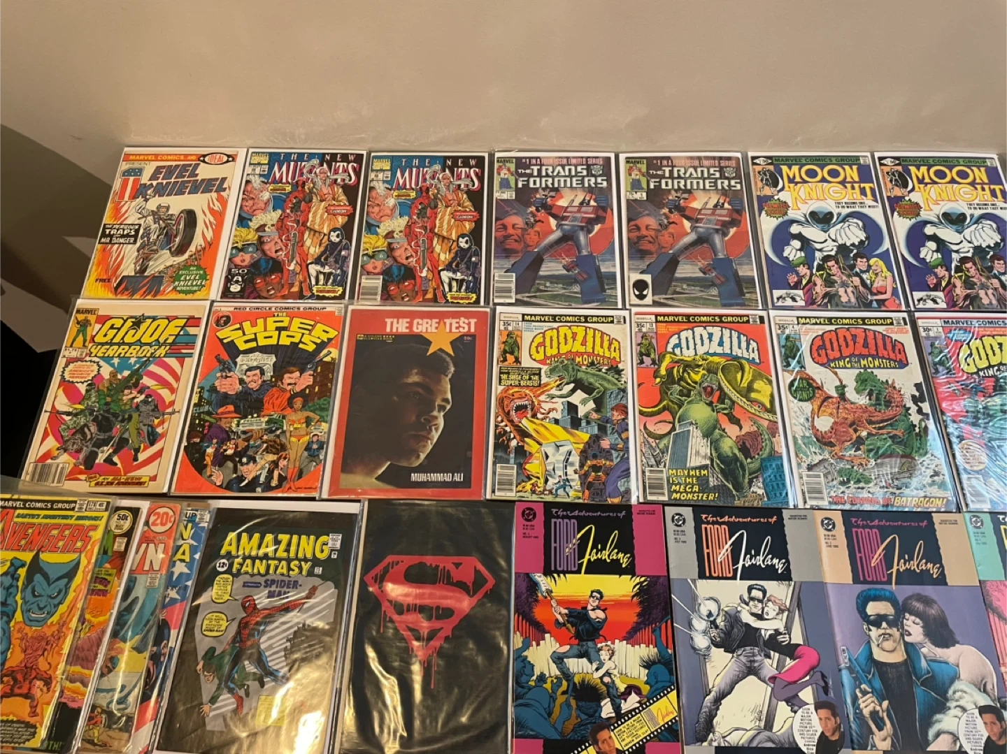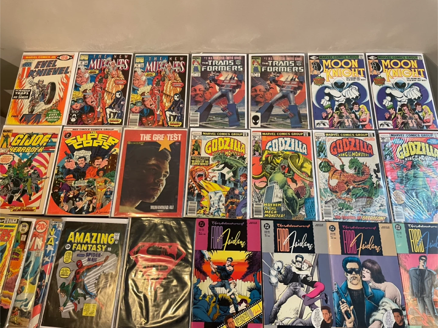 A varied collection of comic books featuring titles like The New Mutants, Transformers, G.I. Joe, Godzilla, Moon Knight, and Amazing Fantasy. Includes issues from Marvel Comics and DC Comics. These comics are great for collectors and fans of classic comic art and stories. 25$ and up
