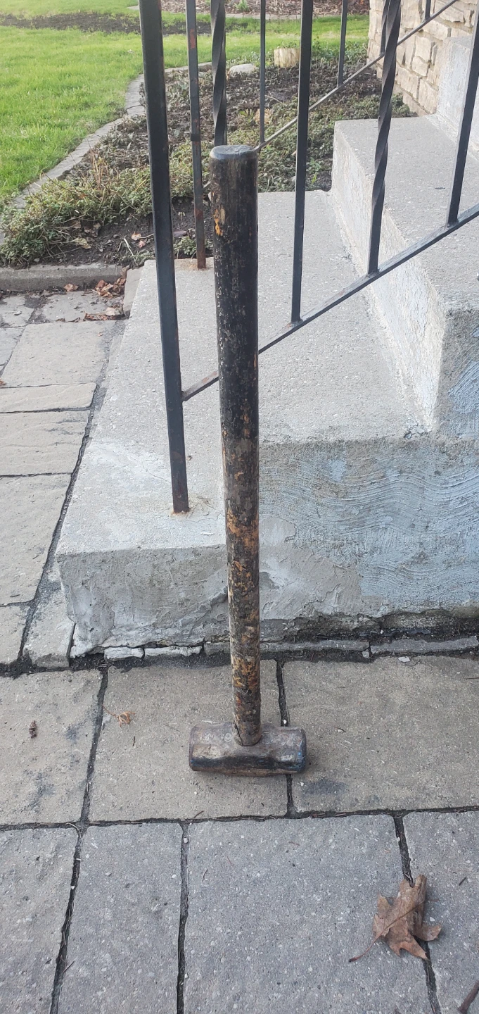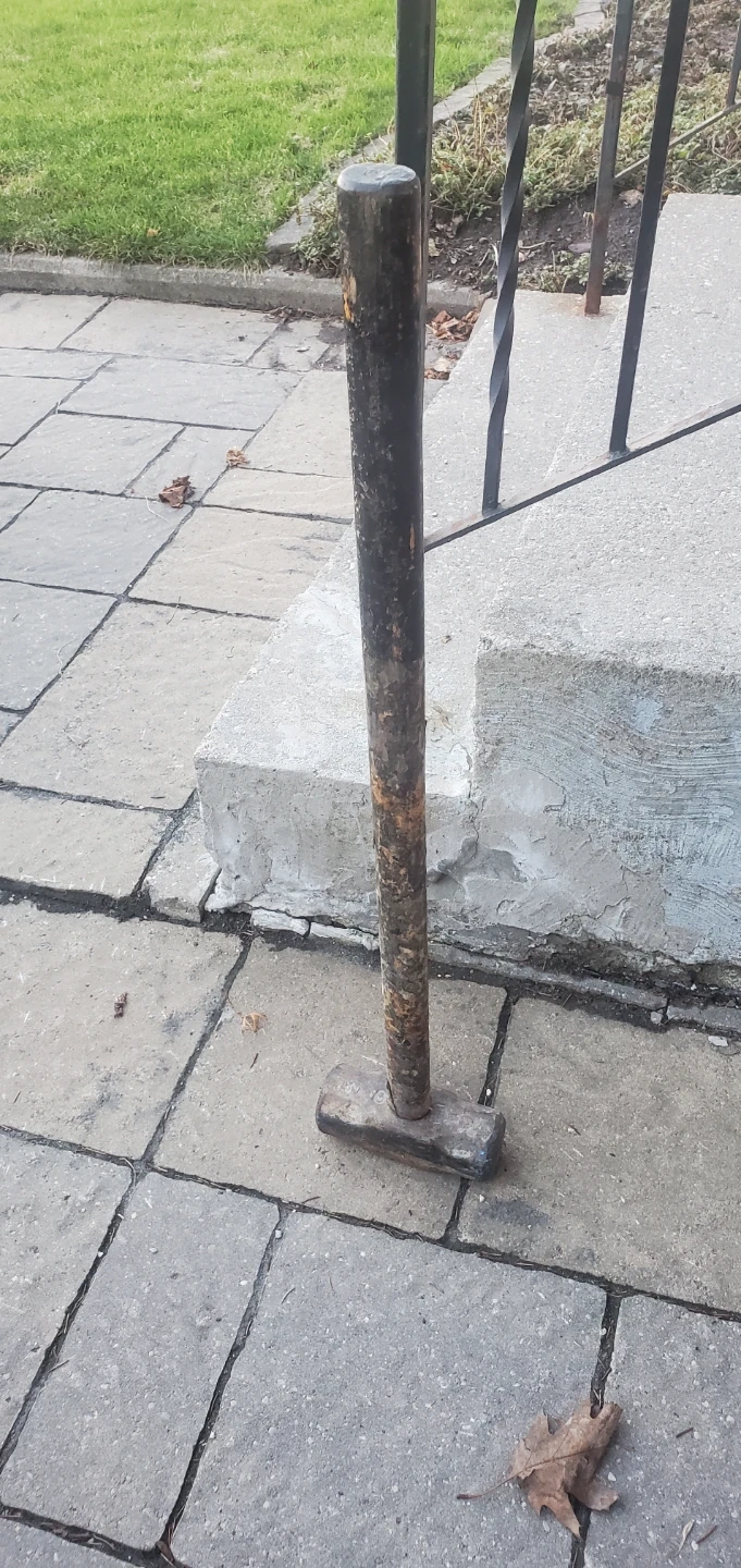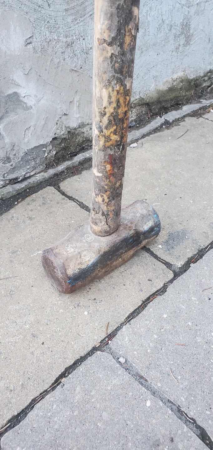 This is a sturdy sledgehammer with a wooden handle and a metal head. It's got some wear from use but is still ready for tough jobs. Metal head, wooden handle.