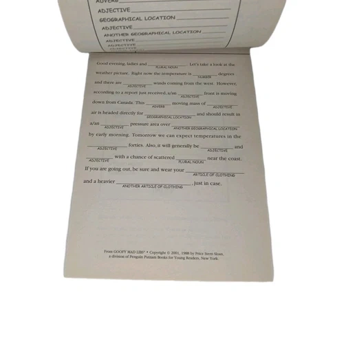 Dive into a world of laughter and creativity with "Goofy Mad Libs: World's Greatest Word Game" by Leonard Stern and Roger Price. This trade paperback edition is perfect for word game enthusiasts and fans of humor. Published by Price Stern Sloan in 2001, it offers a nostalgic trip with its classic English language charm. The book features the iconic Mad Libs format that has entertained generations, challenging players to fill in the blanks with the wackiest words they can muster. Whether you're looking for a fun group activity or a light-hearted read, this game promises to deliver endless entertainment and giggles.