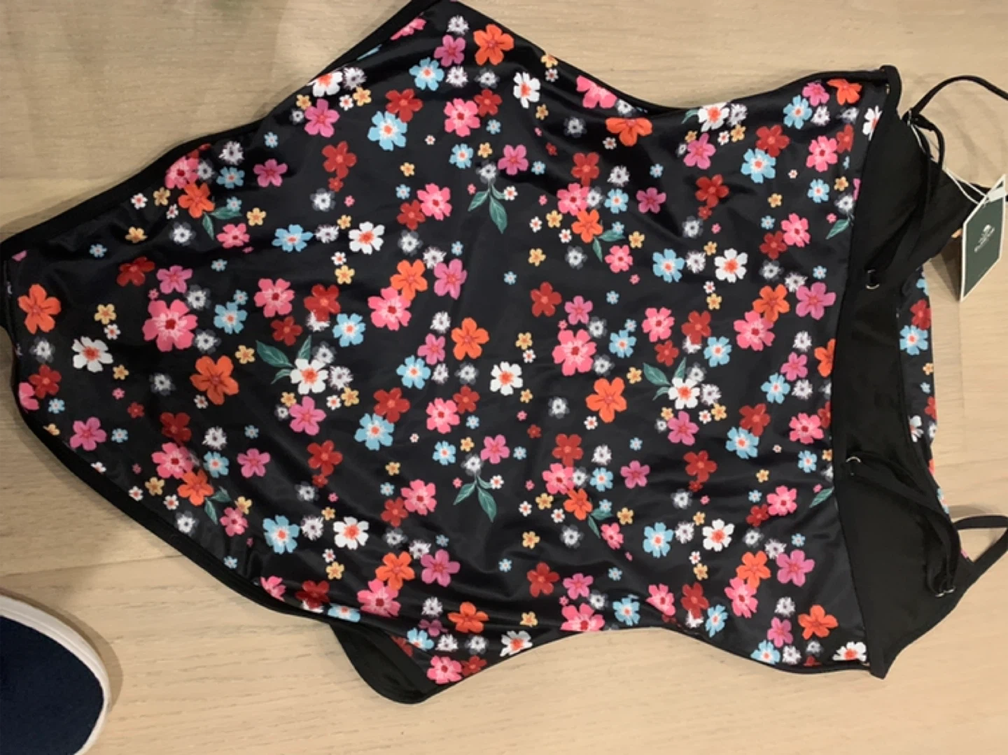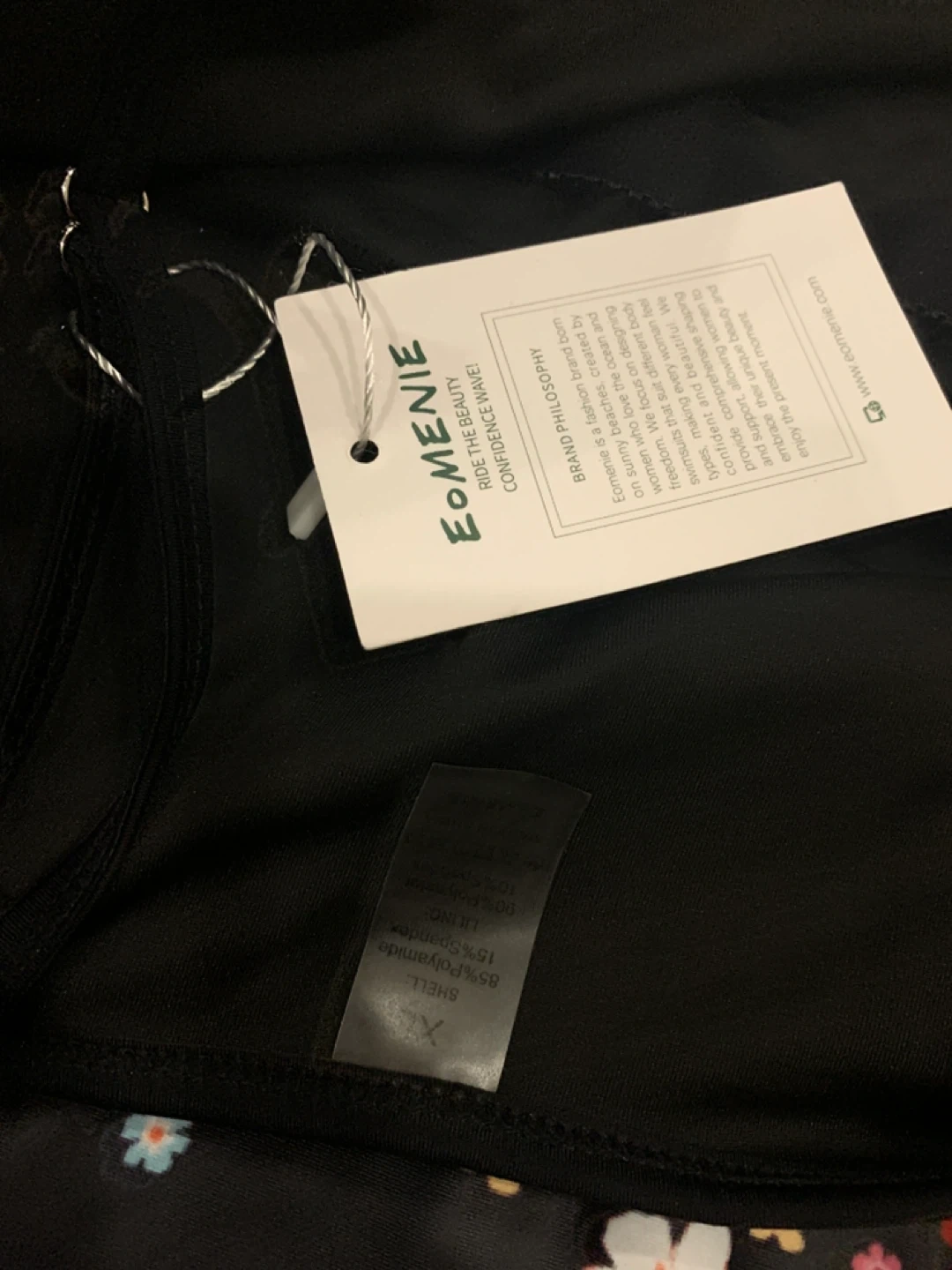 This Eomcnie one-piece swimsuit features a vibrant floral print on a black background. It's made with a shell of 90% polyester and 10% spandex, and lining of 85% polyamide and 15% spandex. Perfect for your next beach vacation!