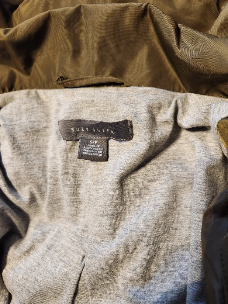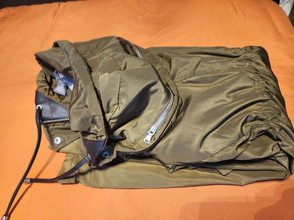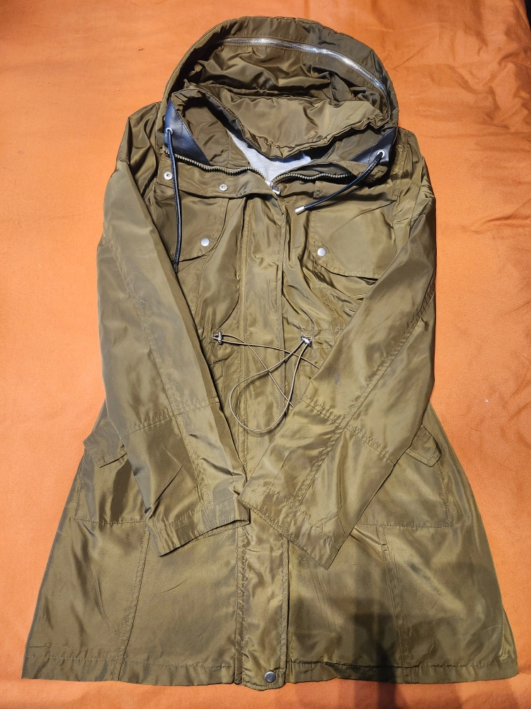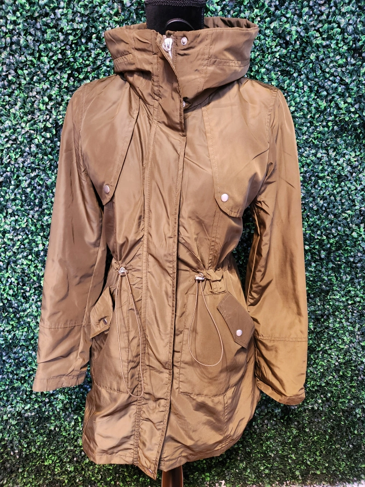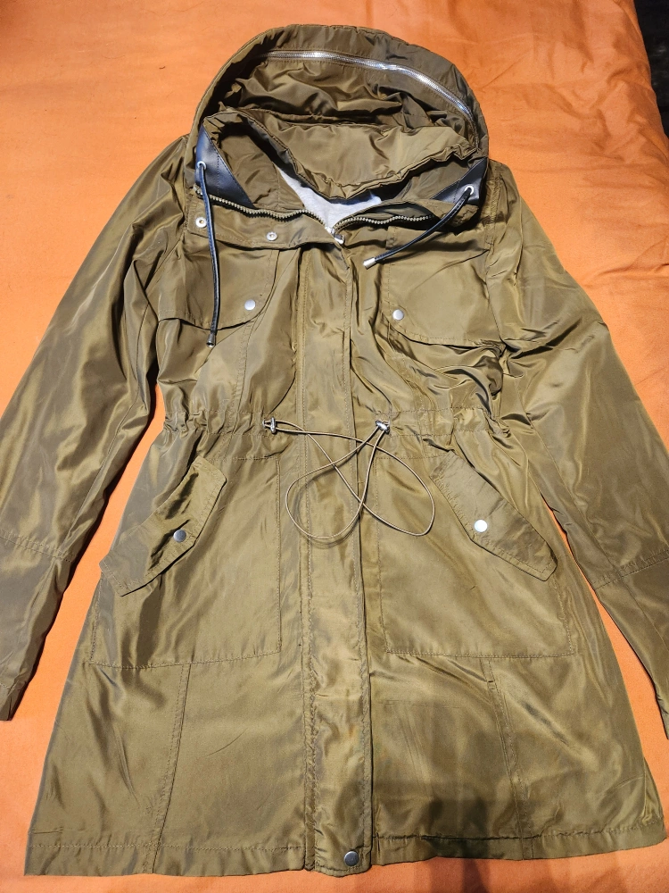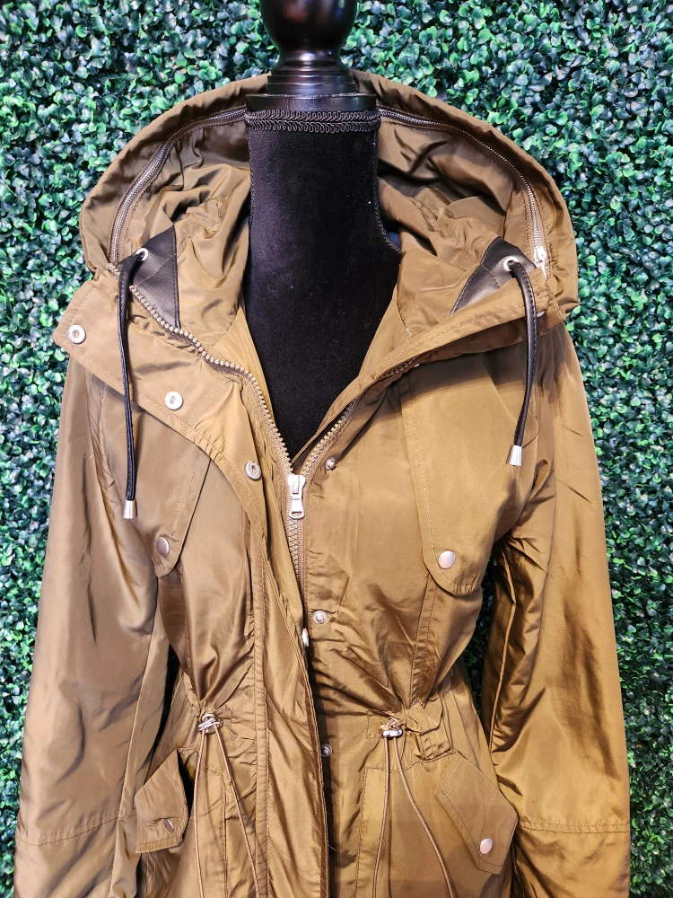 Women's olive green anorak jacket. Features a drawstring waist, zipper closure, and multiple pockets. Long sleeves and a lined hood. Reflective. Size small and will fit a medium.