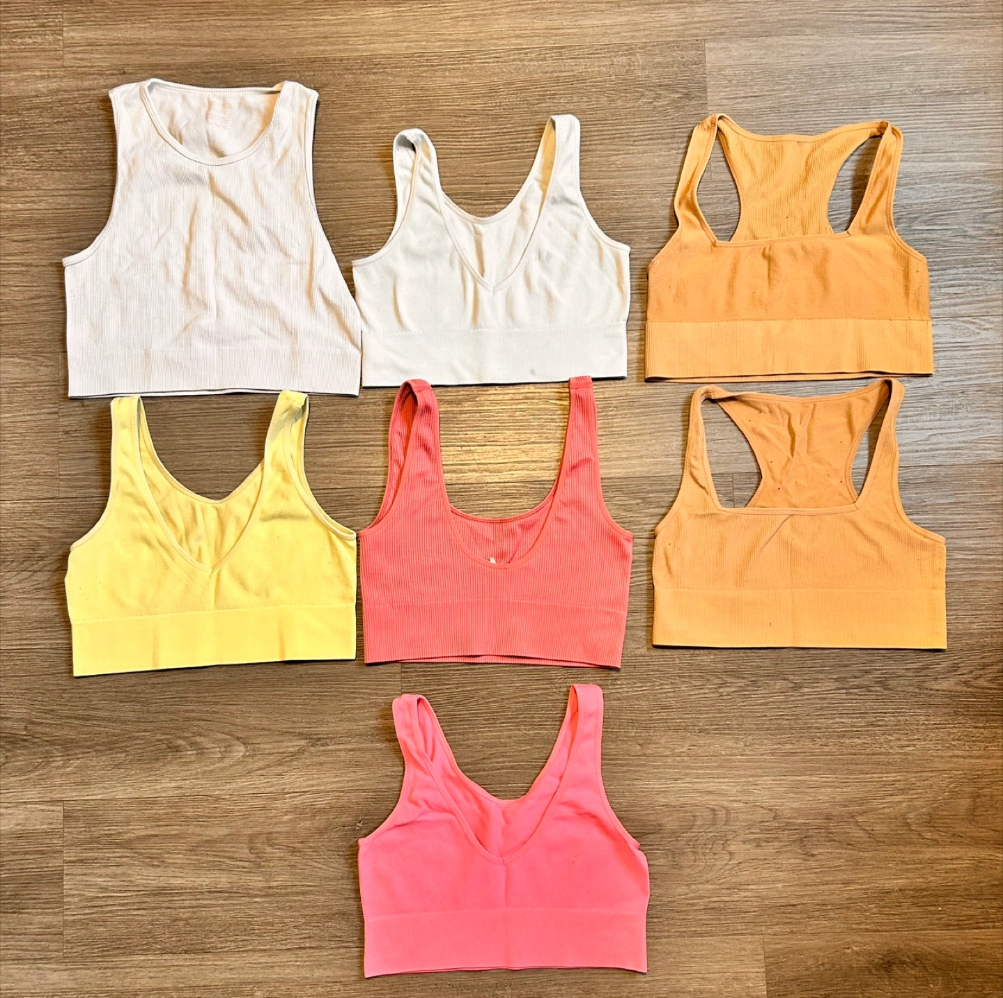 Selling a set of seven sports bras in various colours. They are in great condition and would be perfect for workouts or everyday wear! The colours include white, yellow, brown, and pink.