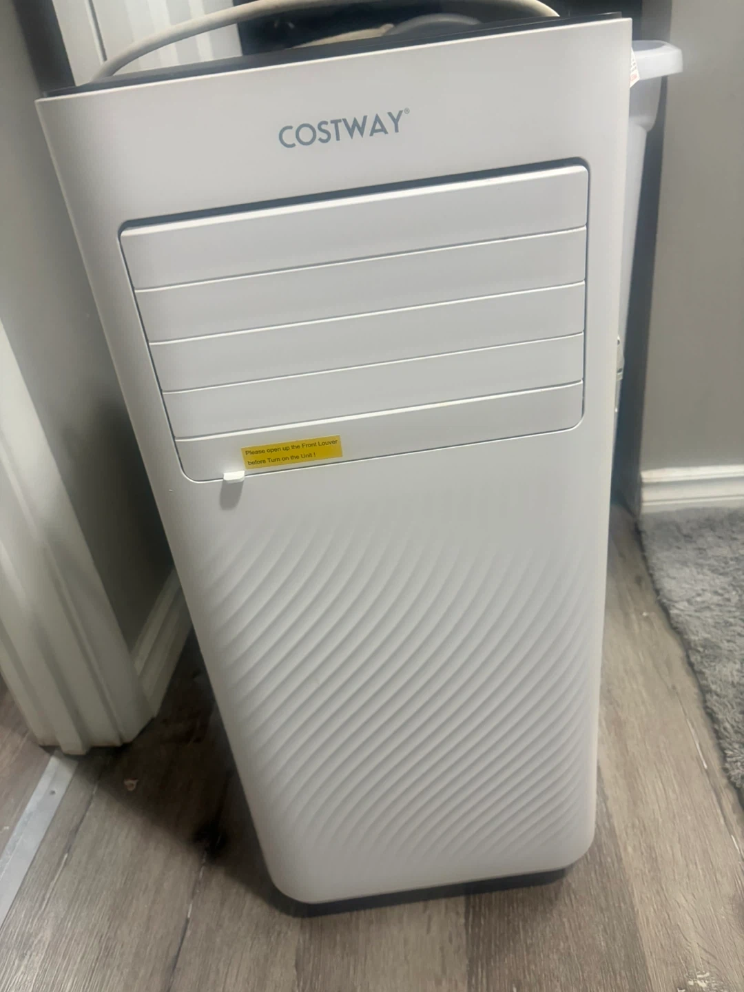 This is a COSTWAY portable air conditioner. It's white and has a sleek design. It comes with adjustable louvres for air direction.