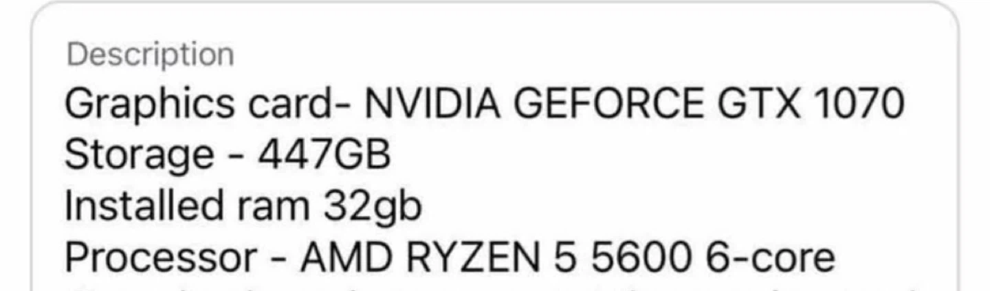 Selling a custom-built gaming PC. It features an NVIDIA GEFORCE GTX 1070 graphics card and an AMD RYZEN 5 5600 6-core processor. It also has 447GB of storage and 32GB of installed RAM. Great for gaming!