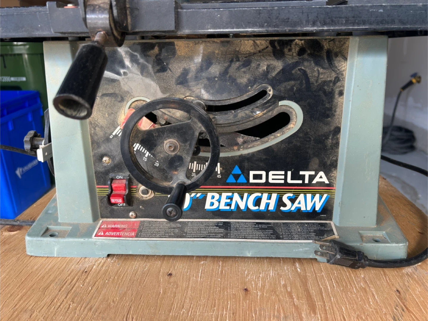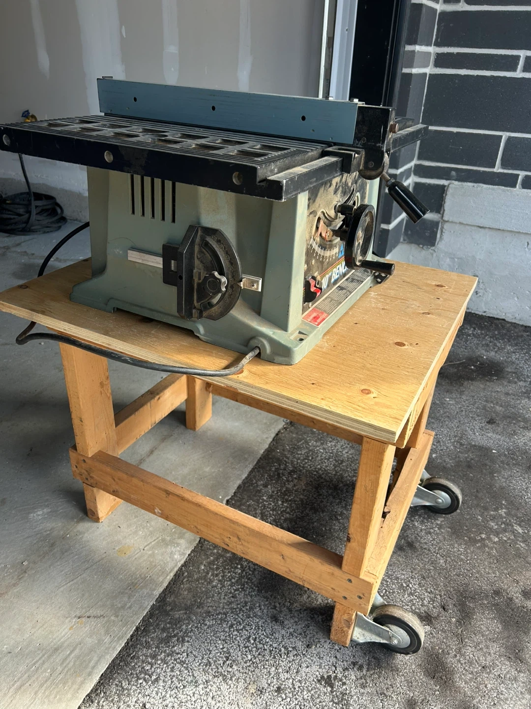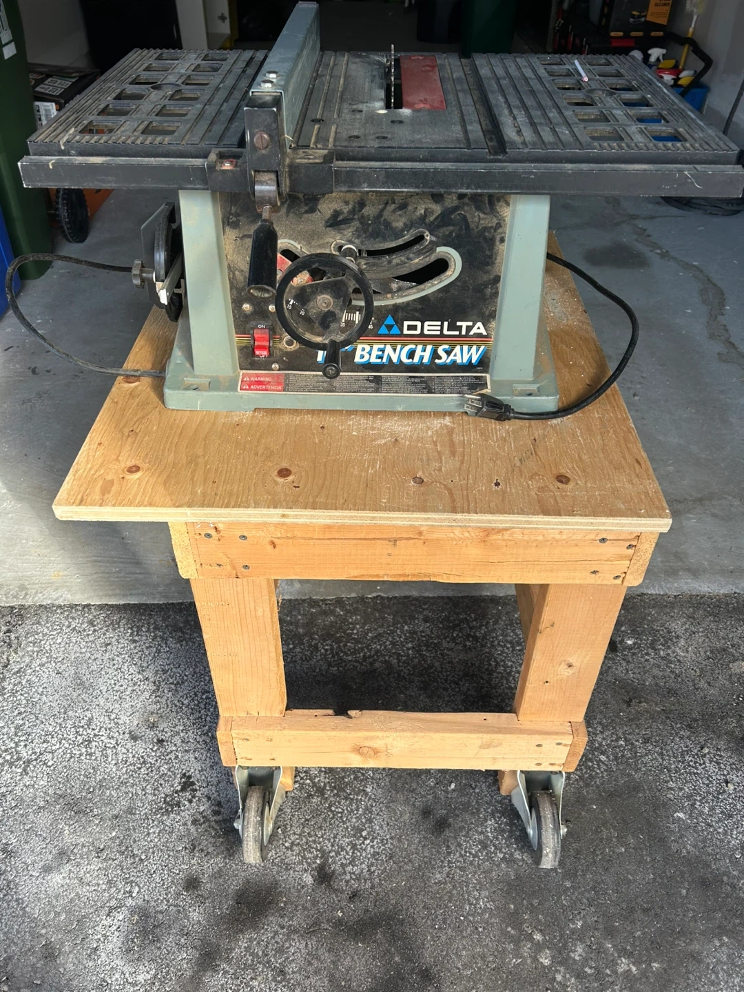 Delta bench saw, model number 36-545 Type 2. It runs on 120V and 13 amps. It's great for various woodworking projects. Saw includes a custom-built stand on wheels.