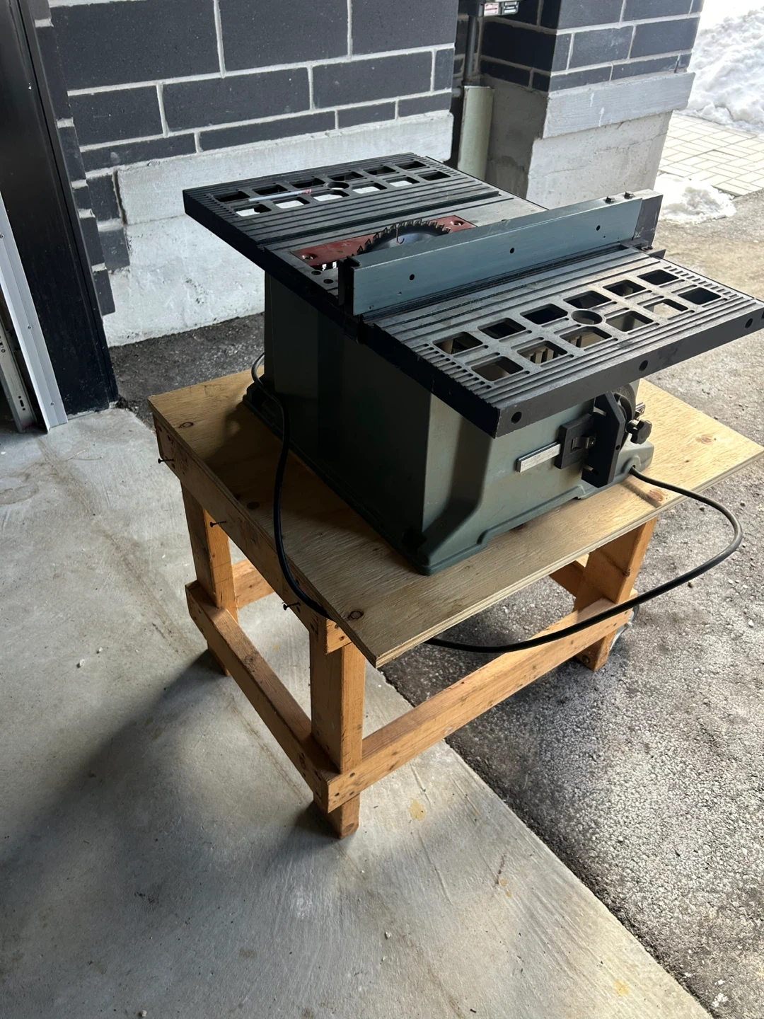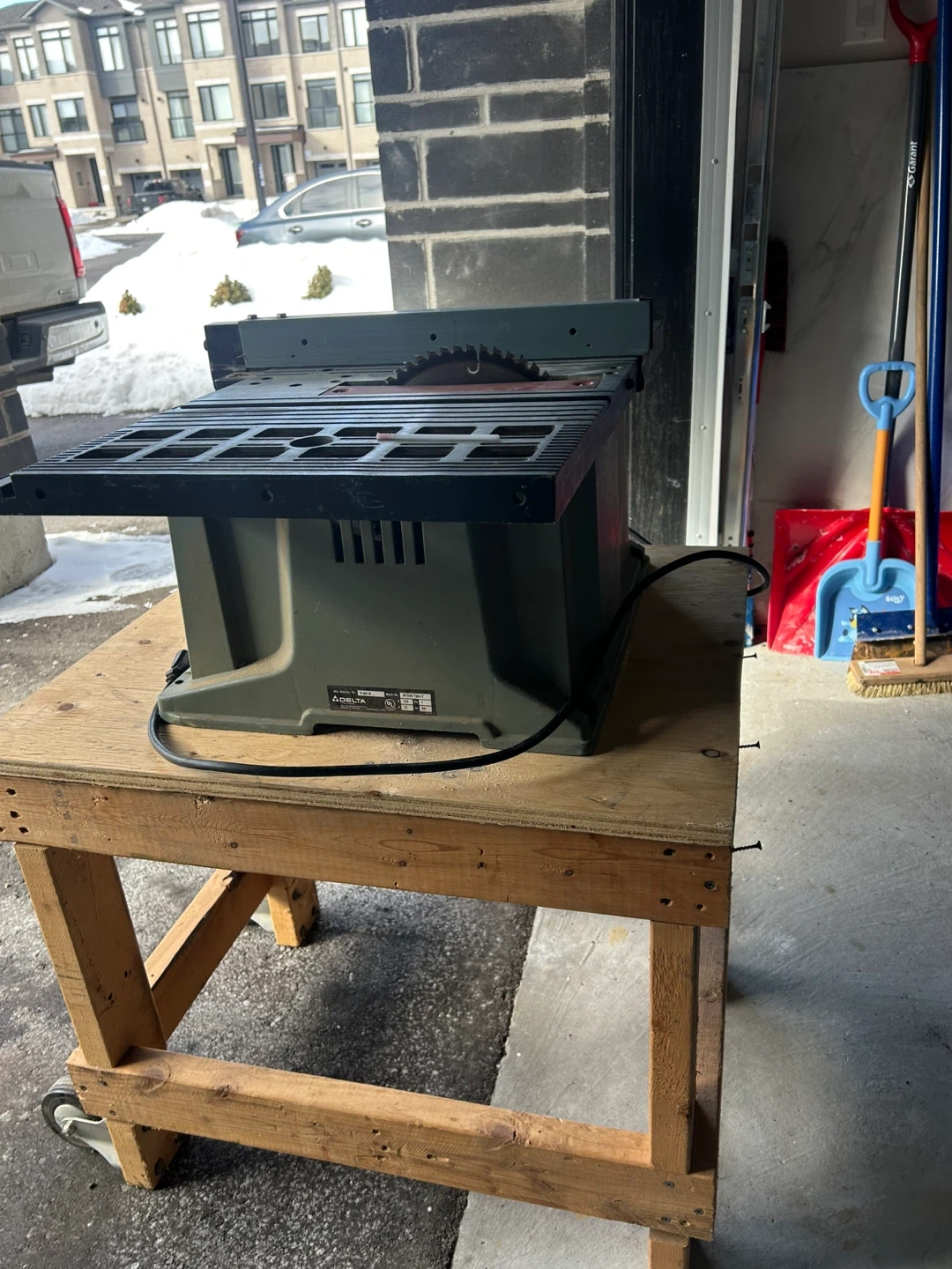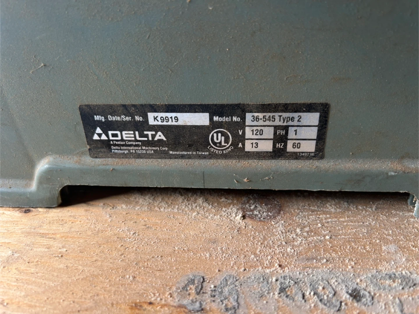 Delta bench saw, model number 36-545 Type 2. It runs on 120V and 13 amps. It's great for various woodworking projects. Saw includes a custom-built stand on wheels.