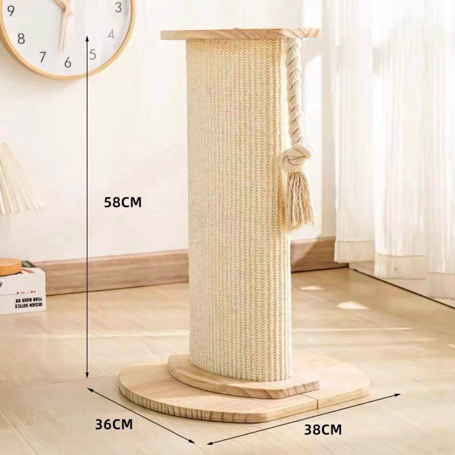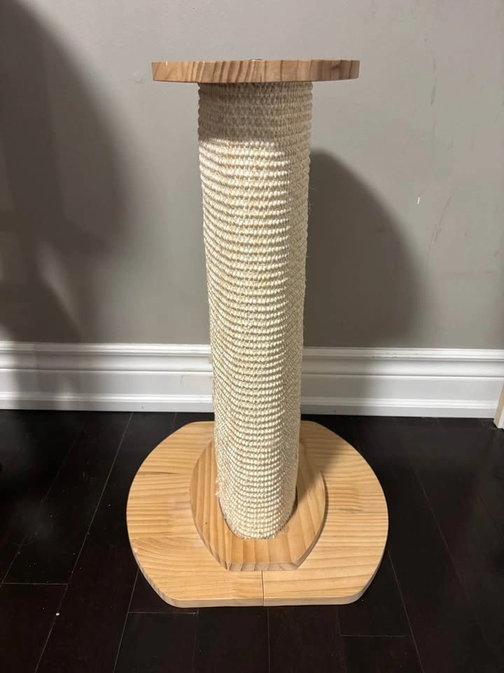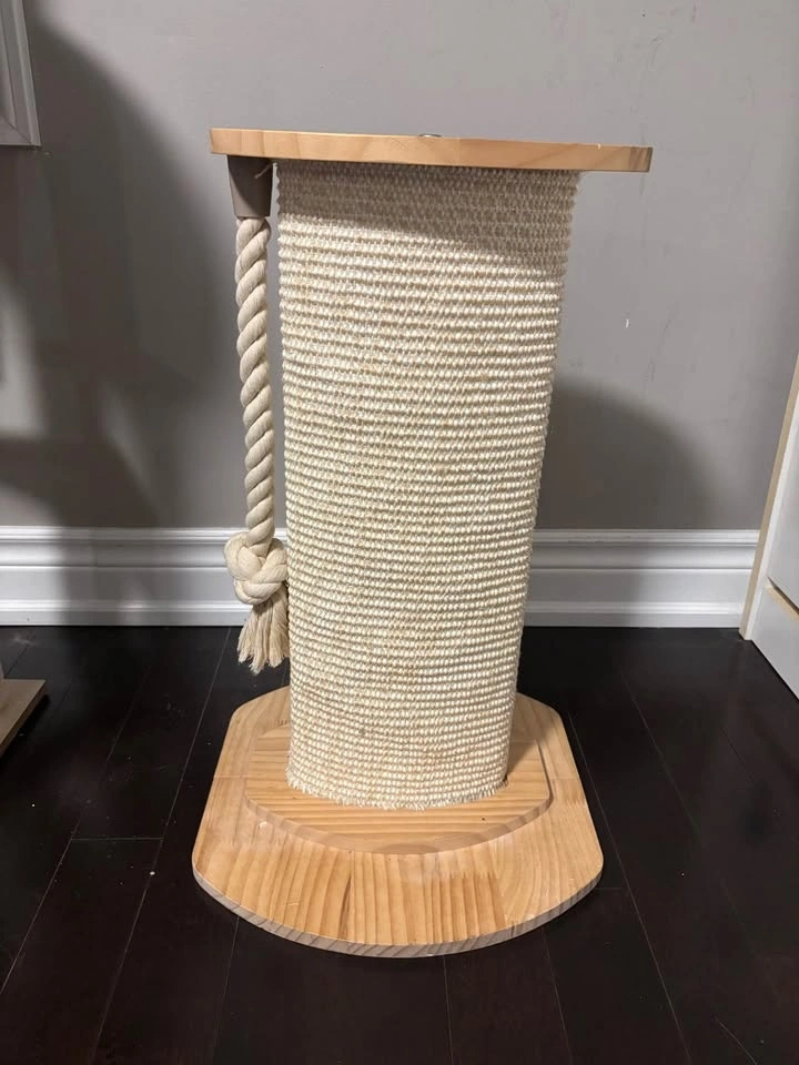 Great cat scratching post with a wood base and top. Comes with a rope toy attached. About 58cm tall, base is 36cm x 38cm.
