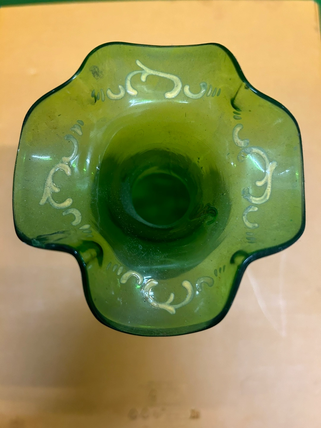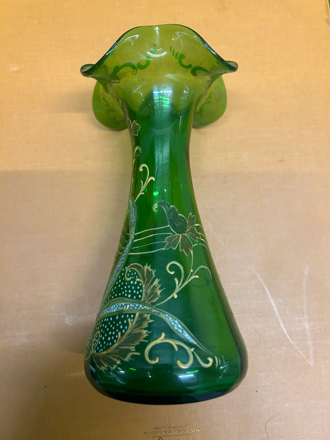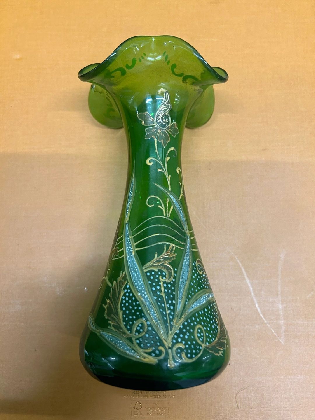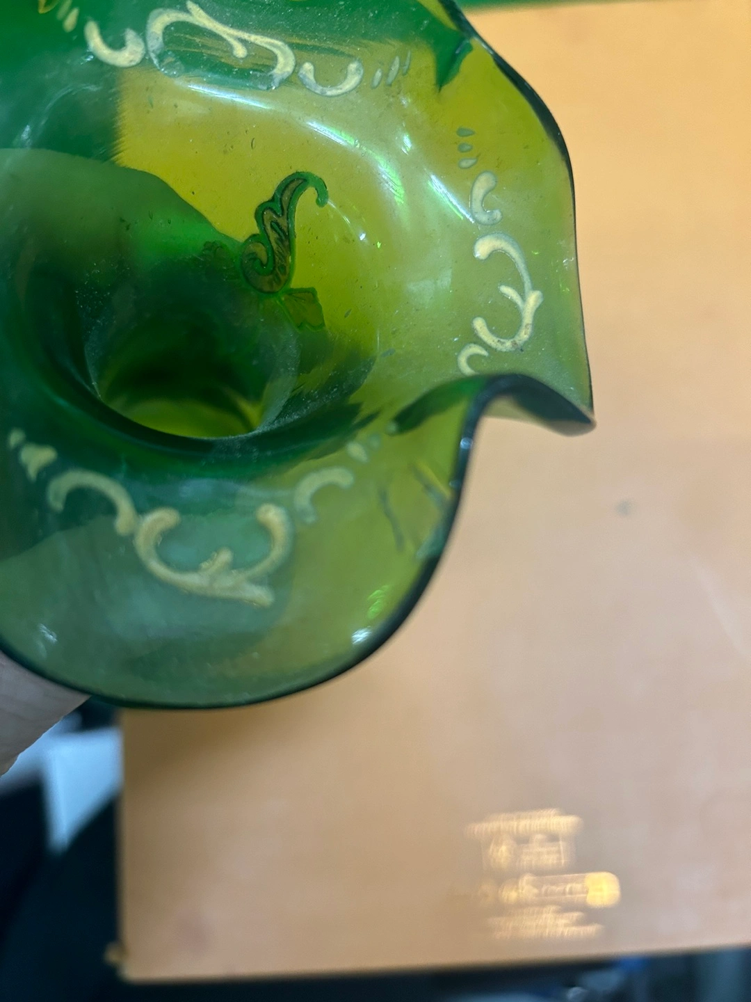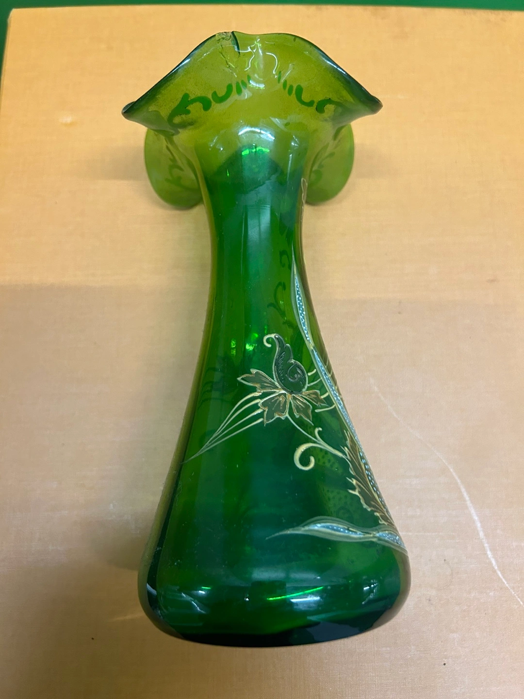 Elegant Mont Joy green vase. Features a flared top and a slender body. Gold leaf detailing throughout. Unique design. Perfect for displaying flowers or as a decorative accent. Small chip on underside of a ruffle, not even noticeable.