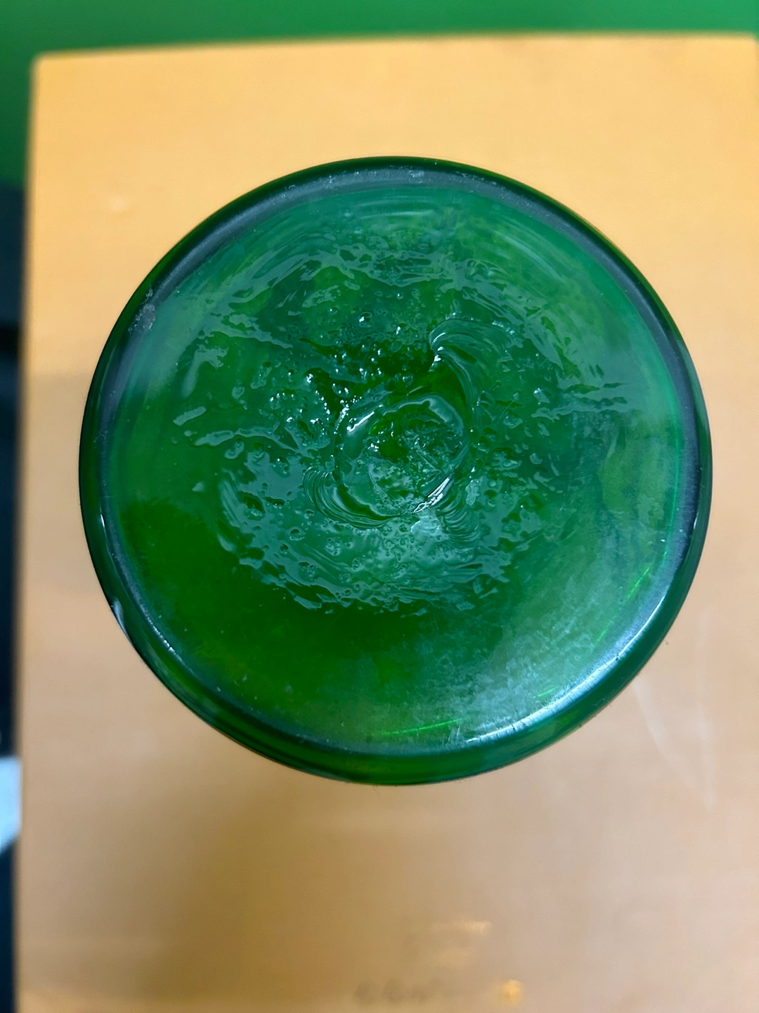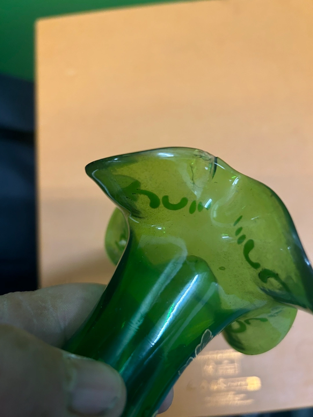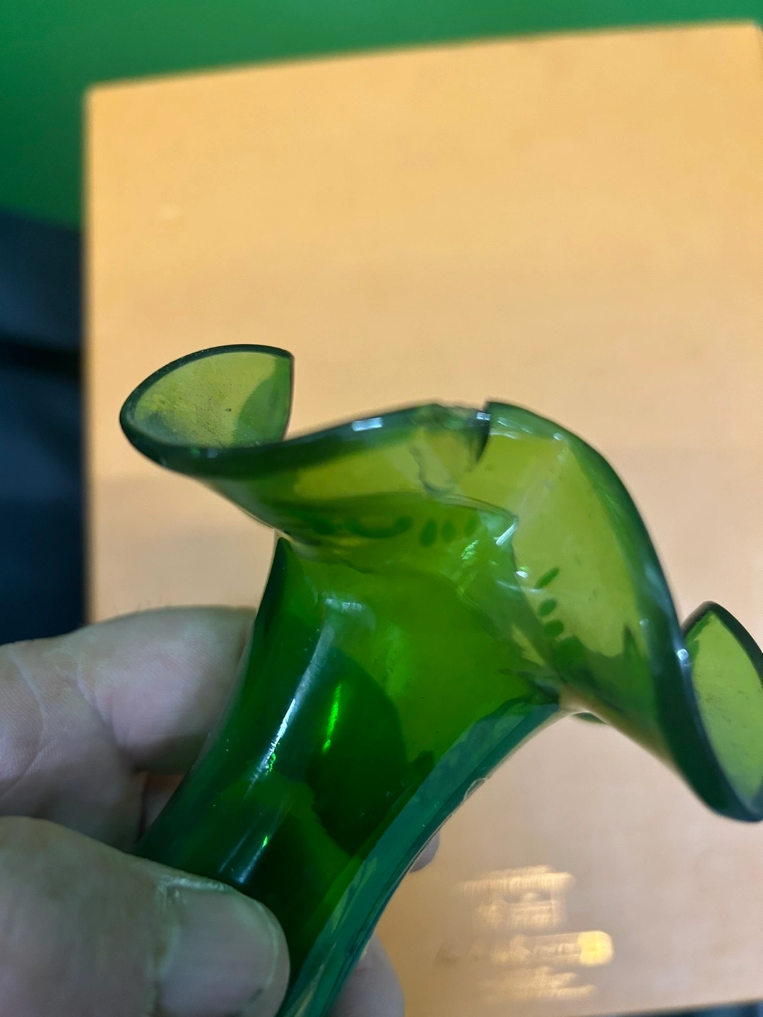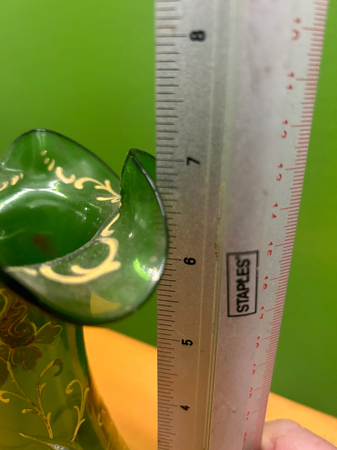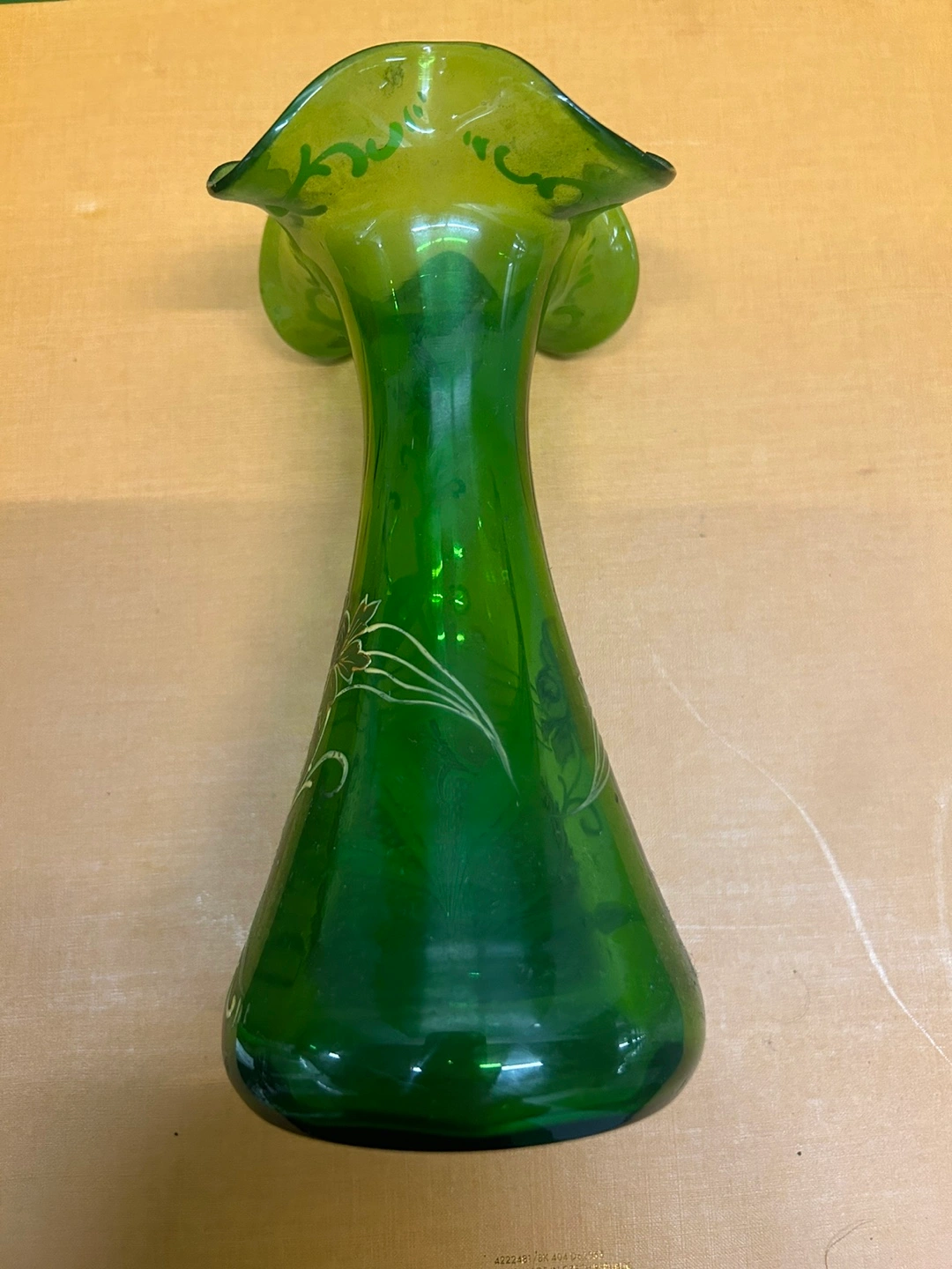 Elegant Mont Joy green vase. Features a flared top and a slender body. Gold leaf detailing throughout. Unique design. Perfect for displaying flowers or as a decorative accent. Small chip on underside of a ruffle, not even noticeable.