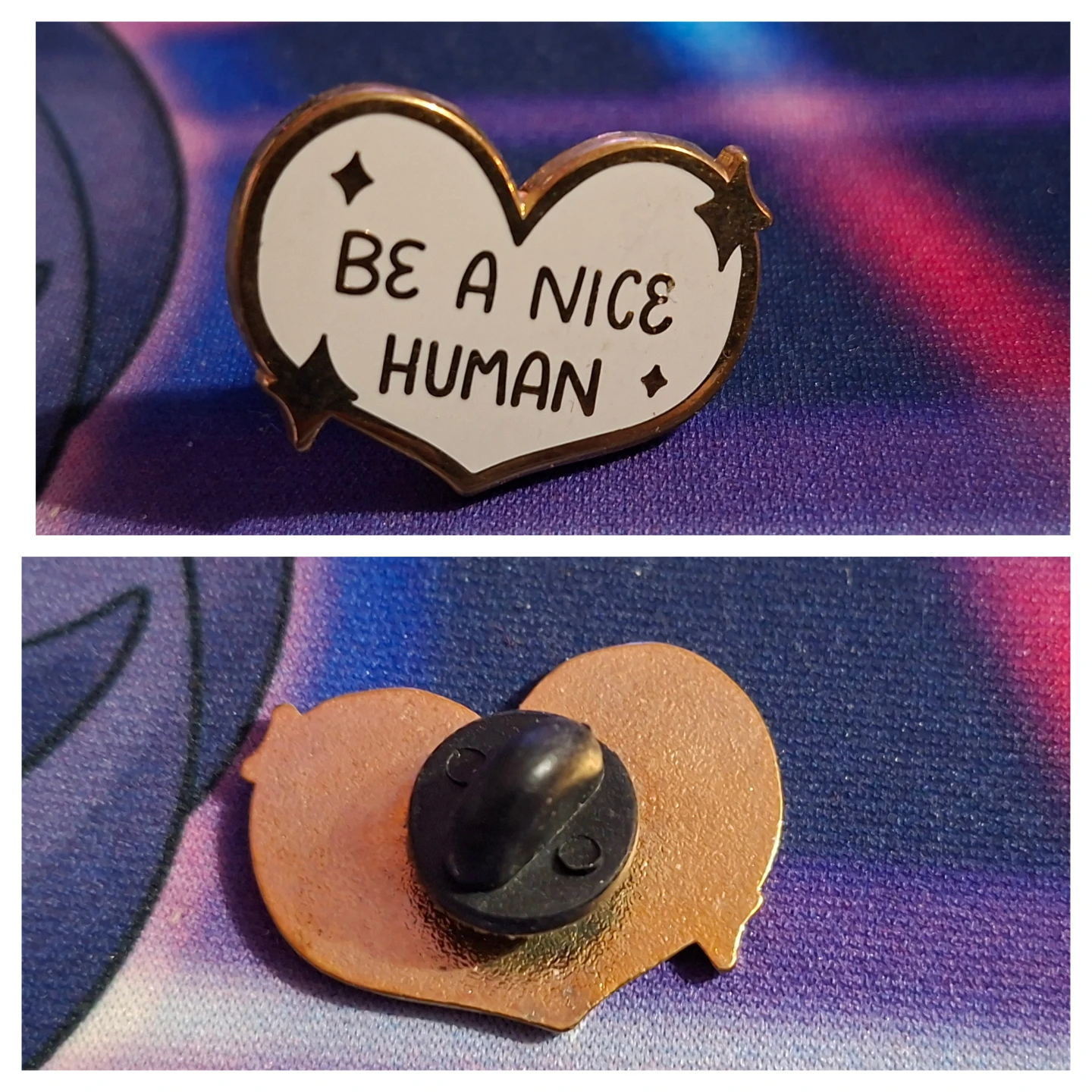 Cute heart-shaped pin that says "Be a Nice Human"!