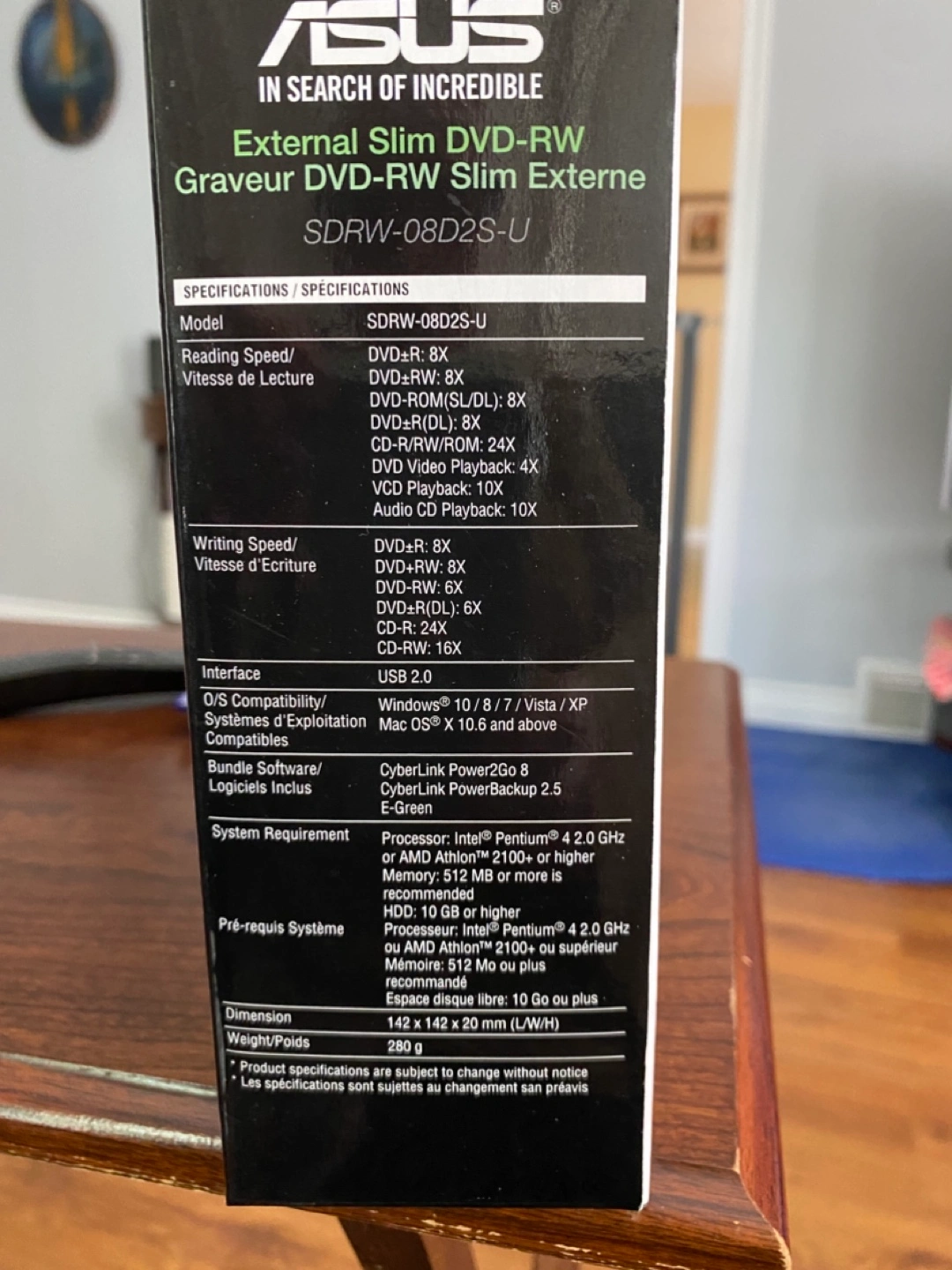 Selling an ASUS External Slim DVD-RW, model SDRW-08D2S-U. It's in great shape and comes with all the original components, including the software CD, quick installation guide, and USB cable. It supports both Mac and Windows operating systems. The dimensions are 142 x 142 x 20 mm, and it weighs 280g
