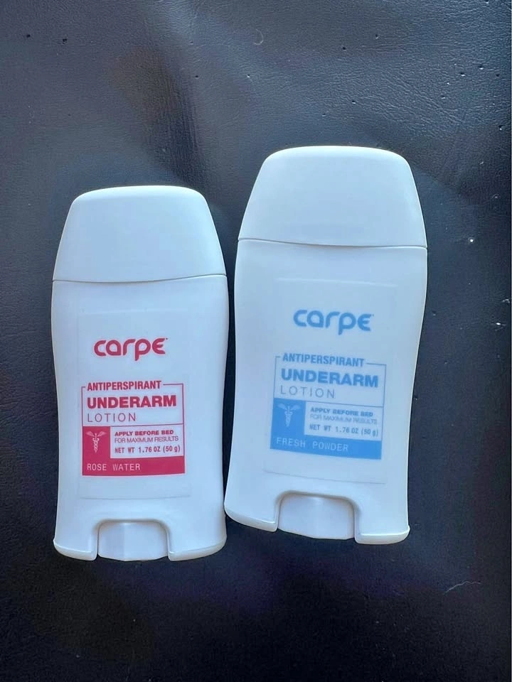 New, never used Carpe deodorant and antiperspirant for underarm hyperhidrosis. This set includes two scents: rose water and fresh powder. I'm selling both together because I prefer the unscented version, which I already own. One of the items is missing its sticker, but it has never been used. Available for pickup downtown.