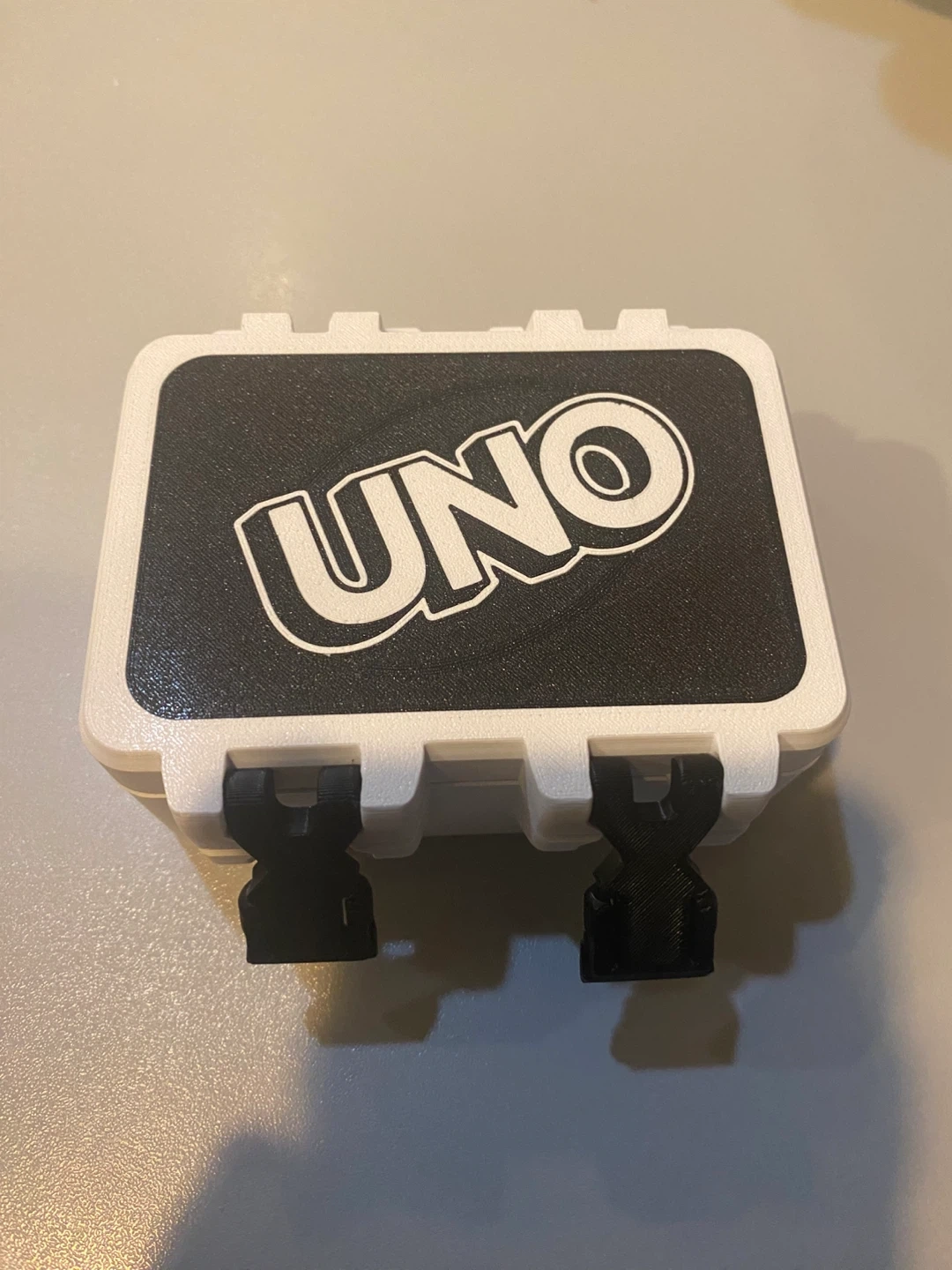 Durable white carrying case for your UNO card game. Features black clasps for secure closure. The UNO logo is prominently displayed on the front. It's great for keeping your game organized and portable!
