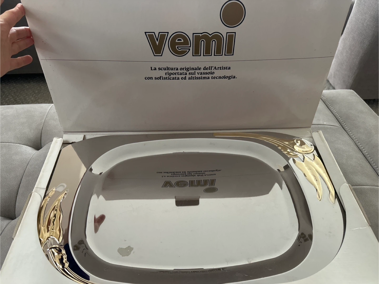 Selling a Vemi decorative tray in silver! It is made in Italy and comes in its original box. It features a unique design with gold accents. Perfect for adding a touch of elegance to your home decor. Used like new.