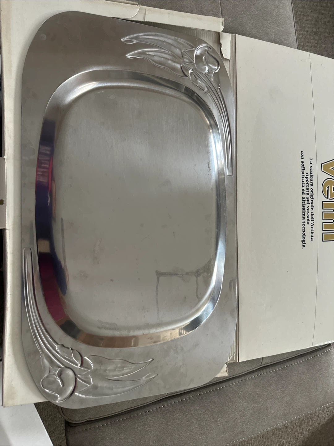 Selling a Vemi decorative tray in silver! It is made in Italy and comes in its original box. It features a unique design with gold accents. Perfect for adding a touch of elegance to your home decor. Used like new.