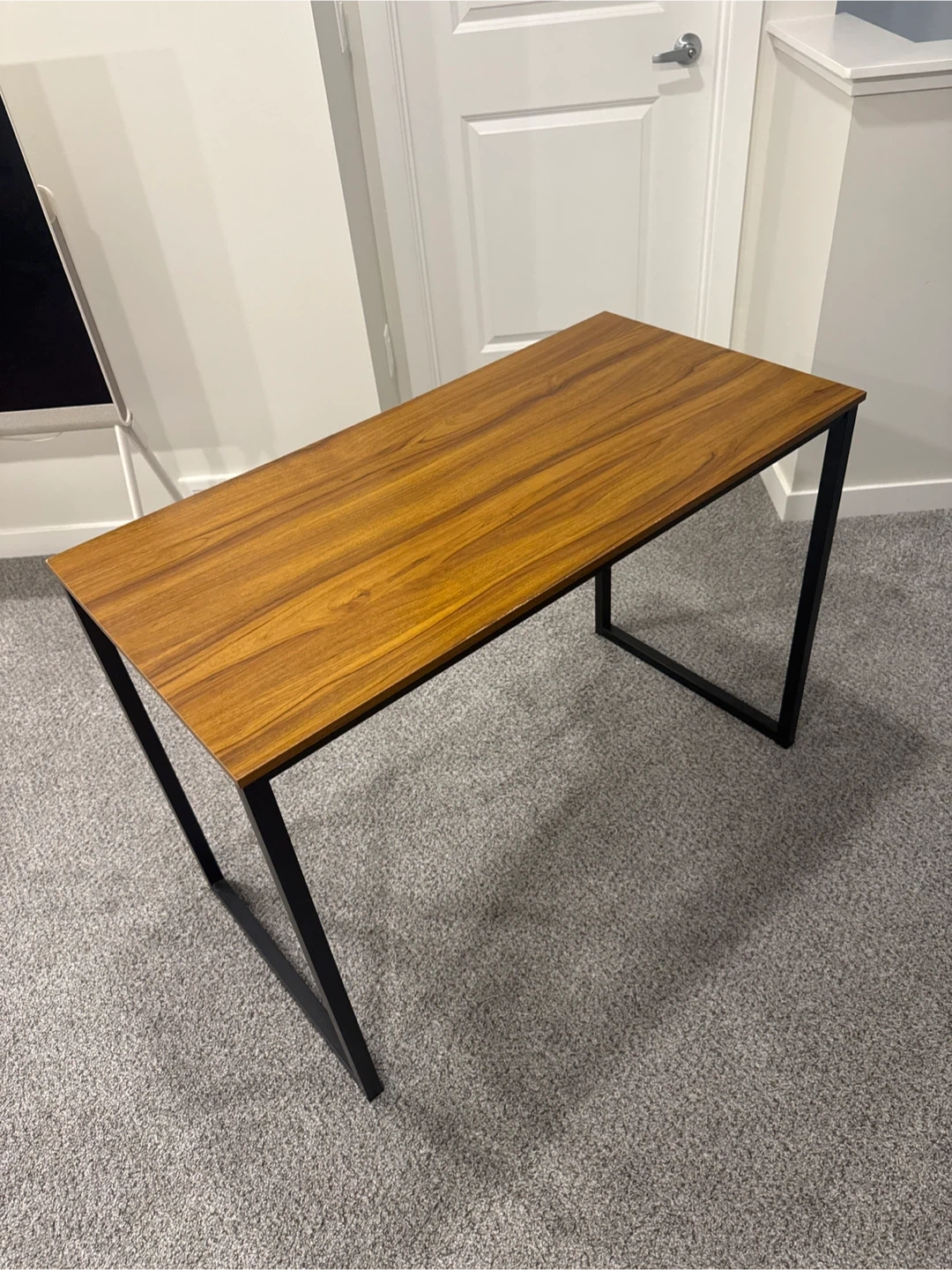 This desk features a wood-look laminate top and a sturdy black metal frame. Its simple design makes it a versatile addition to any room. It's great for a home office or as a console table.