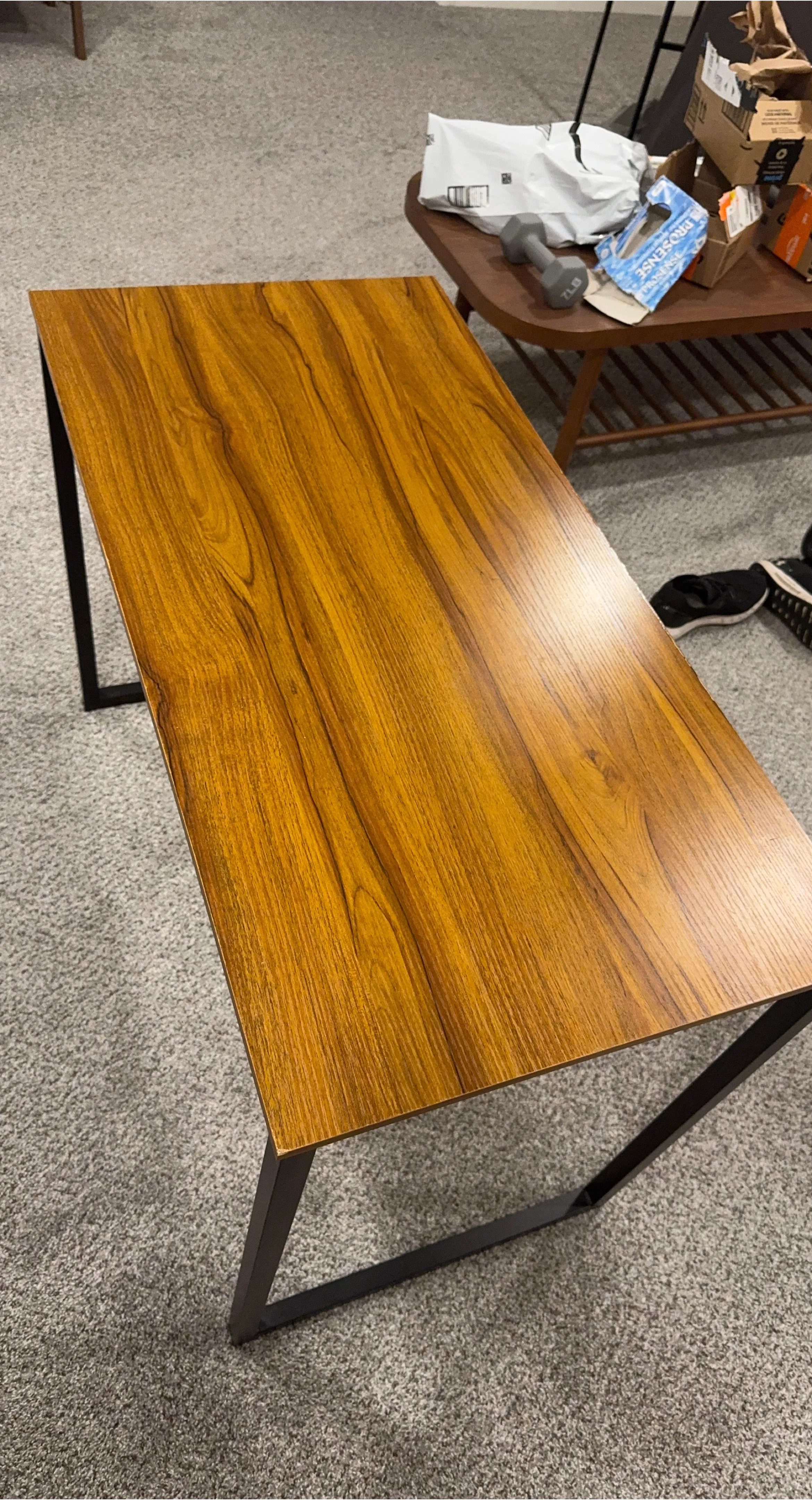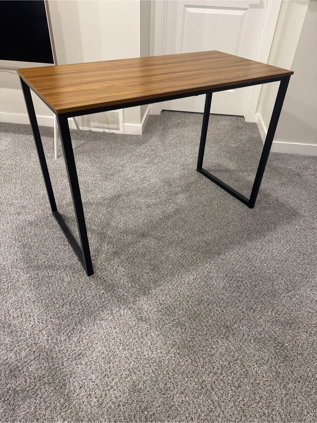 This desk features a wood-look laminate top and a sturdy black metal frame. Its simple design makes it a versatile addition to any room. It's great for a home office or as a console table.