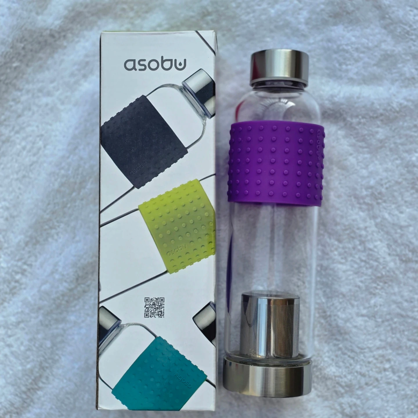 *NEW in box. INFUSER BOTTLE Original Asobu Ice2go 14 ounce Glass water bottle that comes with a stainless steel infuser to put medium Coffee grinds or loose leaf Tea.