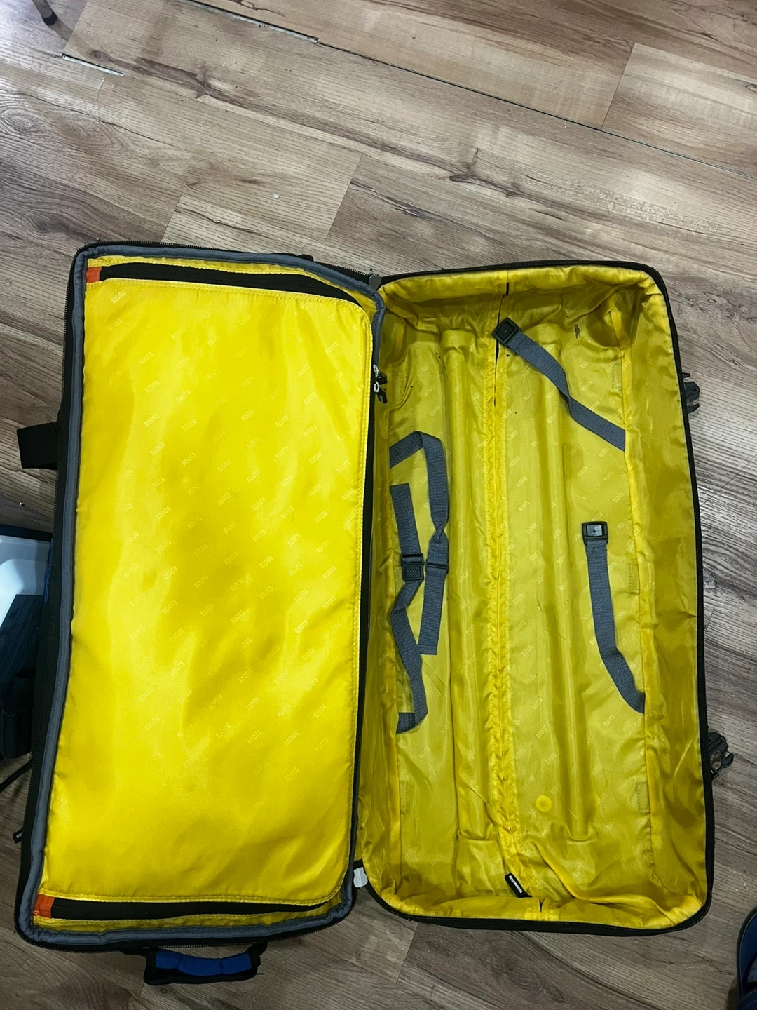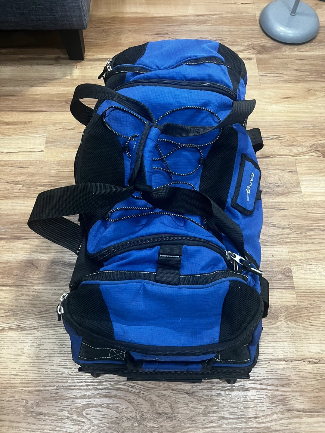 Features include wrapped grab handles, add-a-bag trolley strap, zippered front and side pockets, adjustable padded shoulder strap, large spacious compartment, keeps clothes wrinkle-free, snap tab to secure hanger, and side organization pockets.