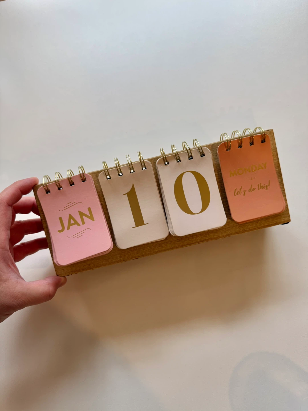 This is a wooden desk calendar. It has flip pages for the month, date, and day of the week. The base is made of wood, perfect for keeping track of the date on your desk!