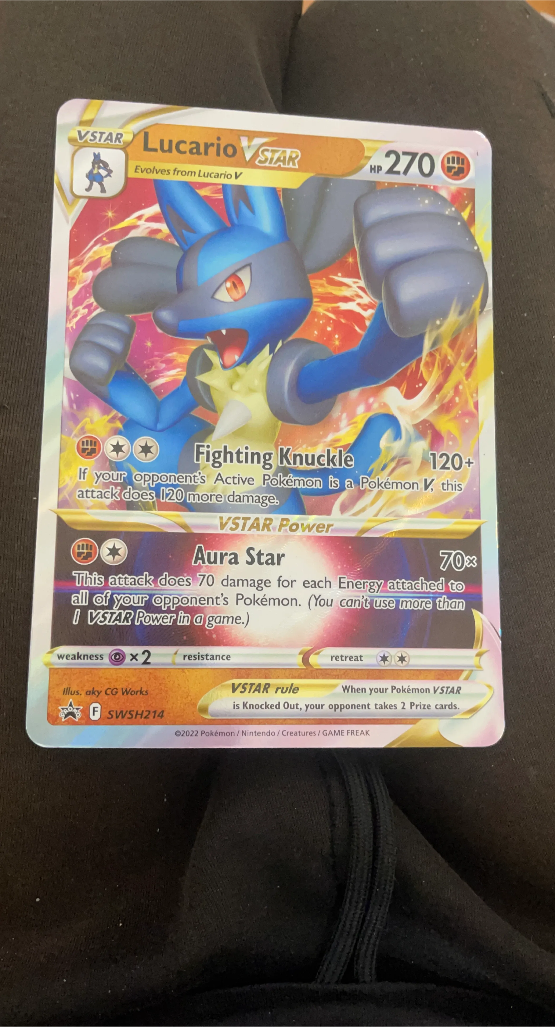 This is the Lucario VSTAR card from Pokemon. It has 270 HP and the Fighting Knuckle attack deals 120+ damage. The Aura Star attack deals 70x damage based on energy attached to your opponent's Pokémon.