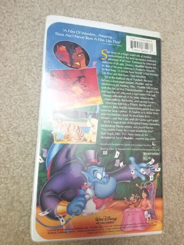 Kid's VHS tape of the original animated classic, Aladdin. The tape is in like-new condition, and the case cover has minor soft plastic crinkles/cracks. It runs for 90 minutes and was made in the USA. Feel free to message if you have any questions!