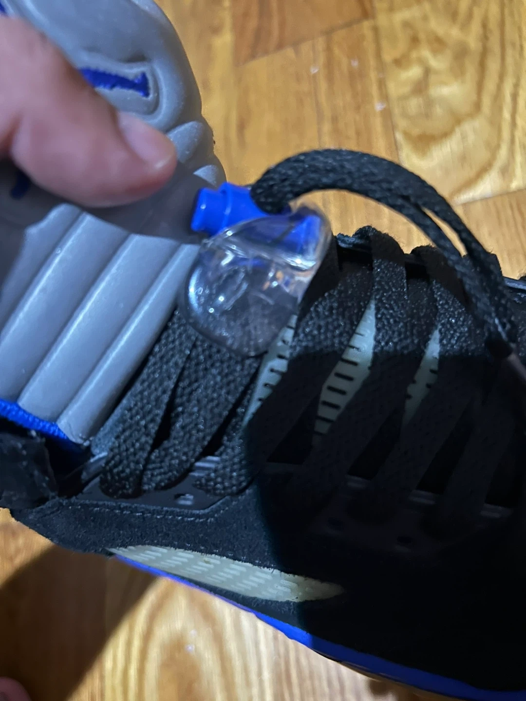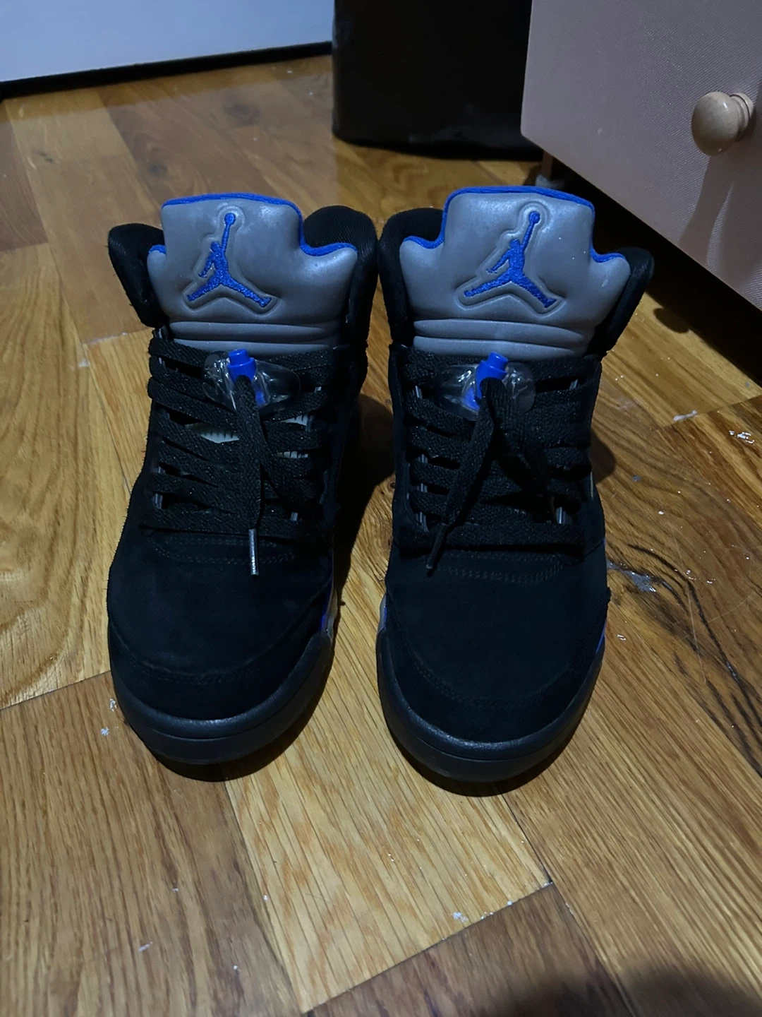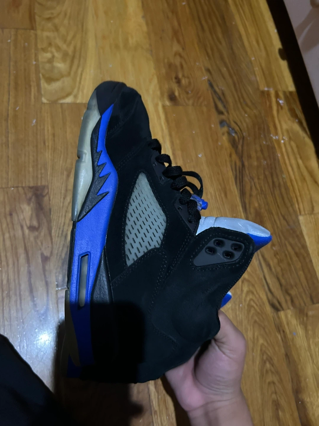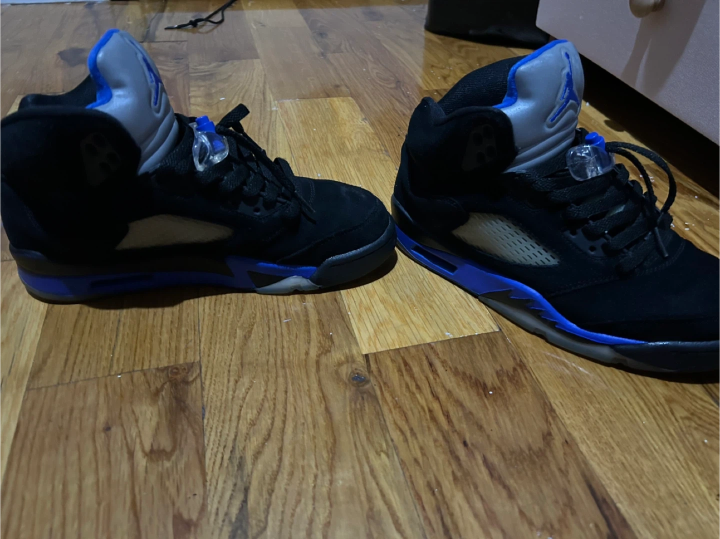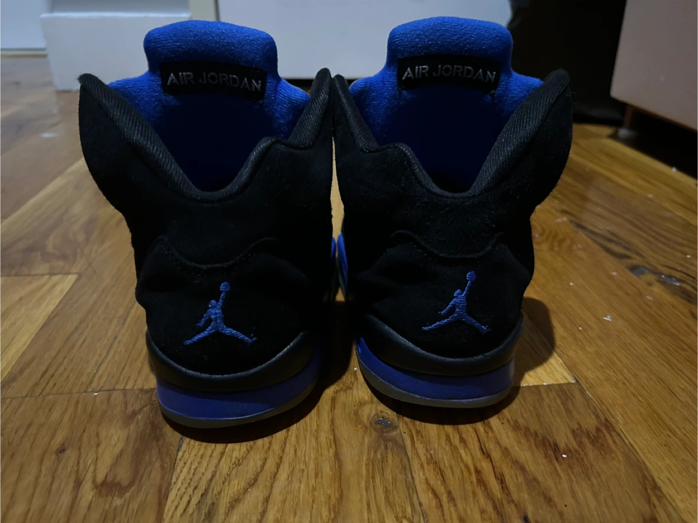 Black suede uppers with royal blue accents. Features the iconic Jumpman logo on the heel and tongue. Lace locks included. Classic high-top silhouette.