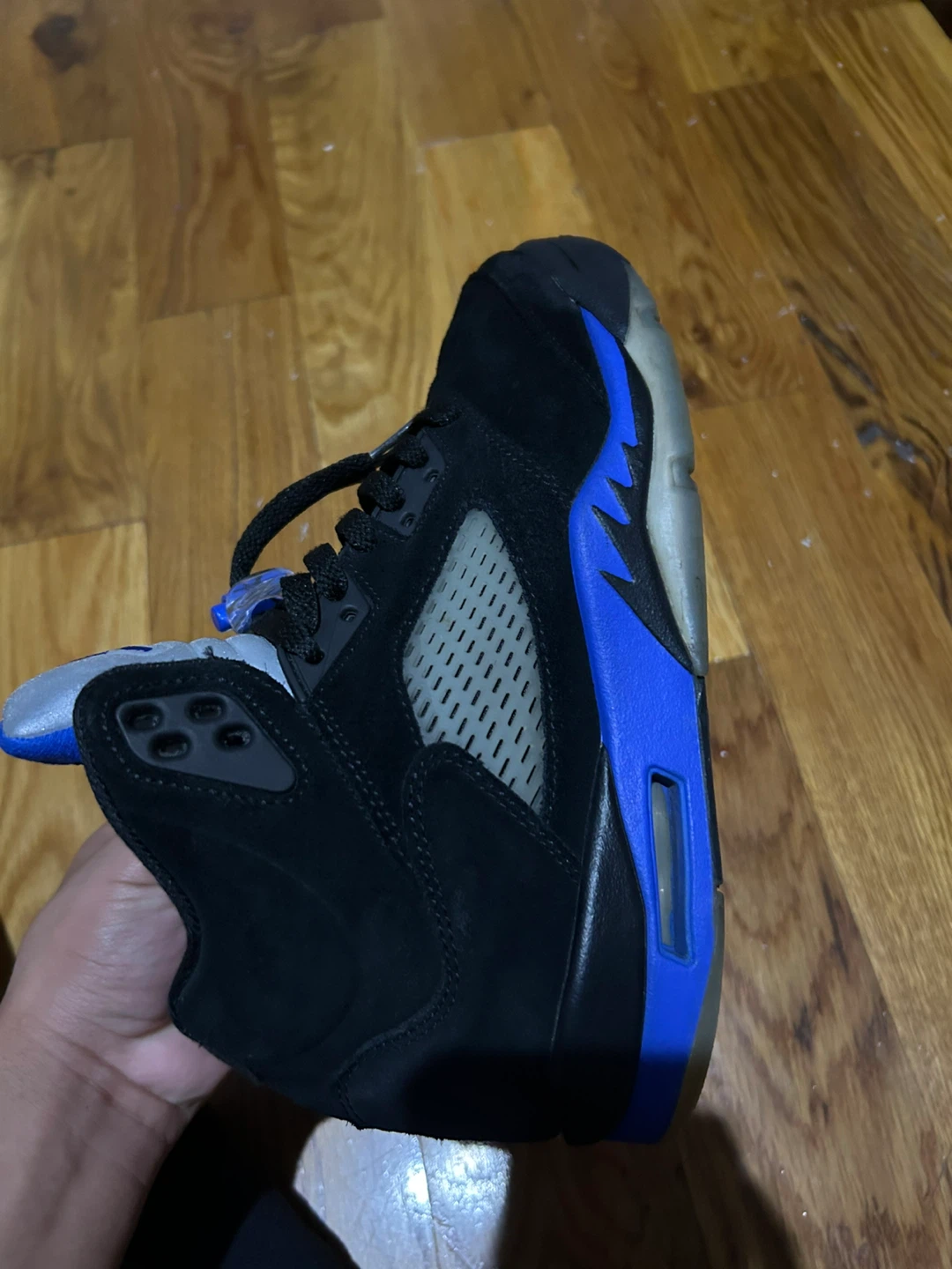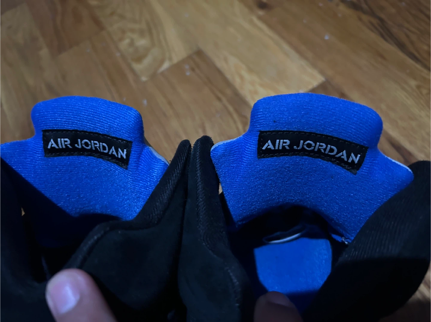 Black suede uppers with royal blue accents. Features the iconic Jumpman logo on the heel and tongue. Lace locks included. Classic high-top silhouette.