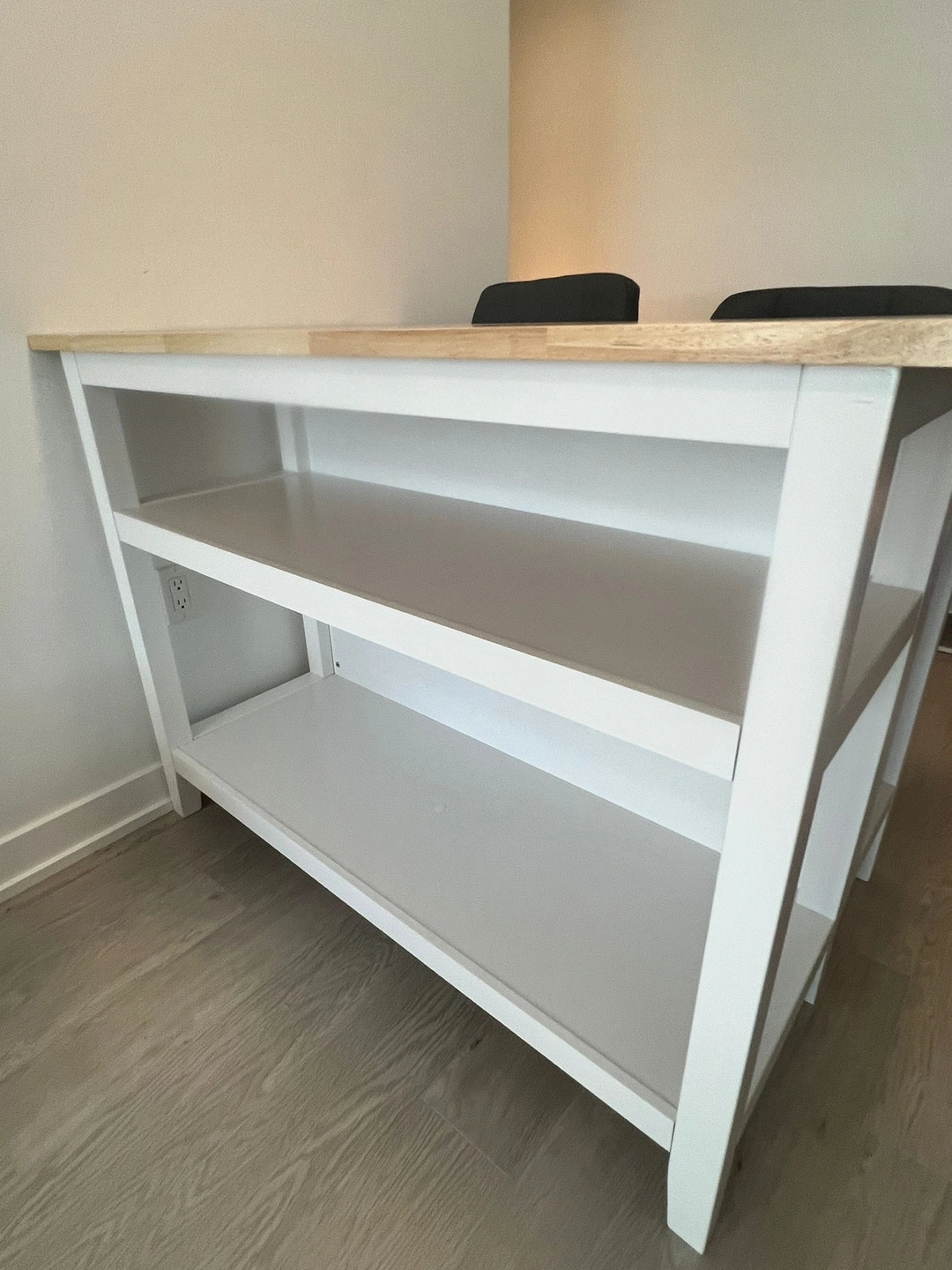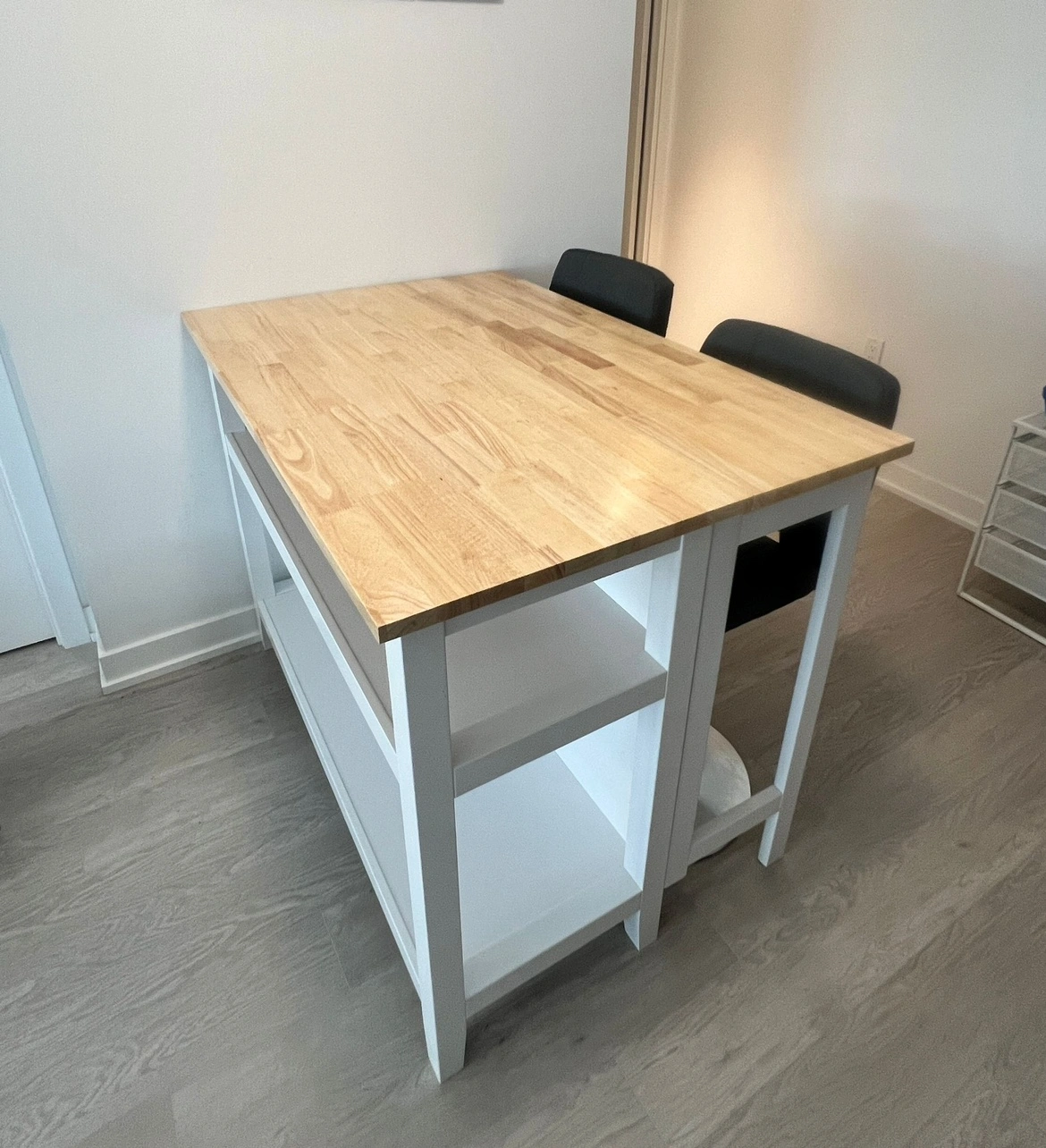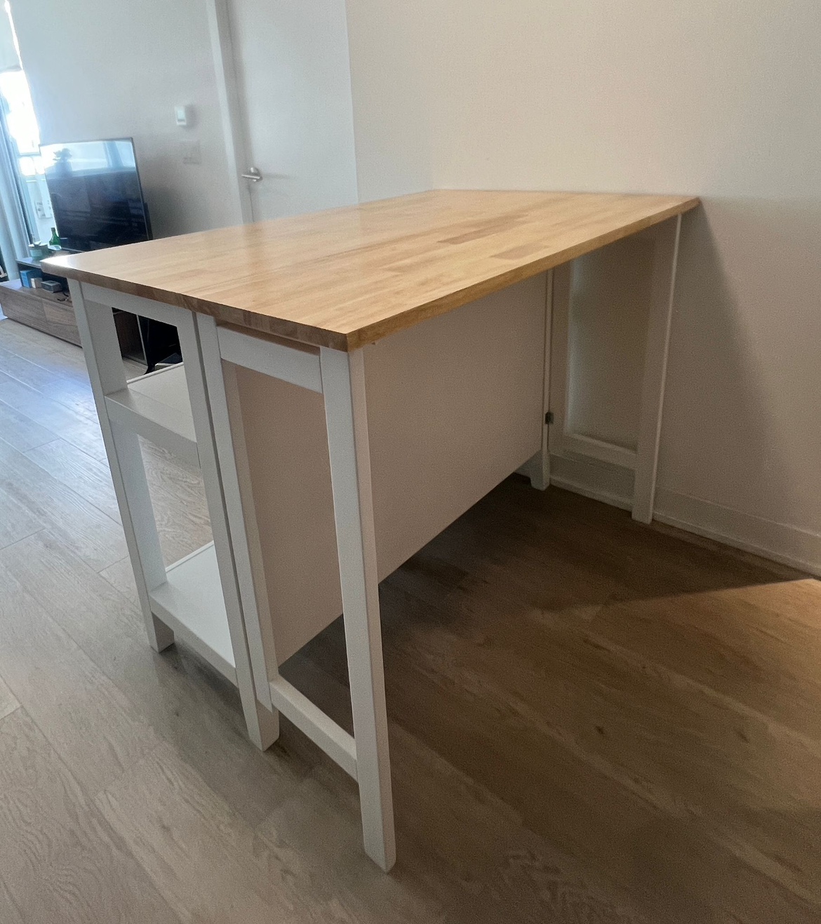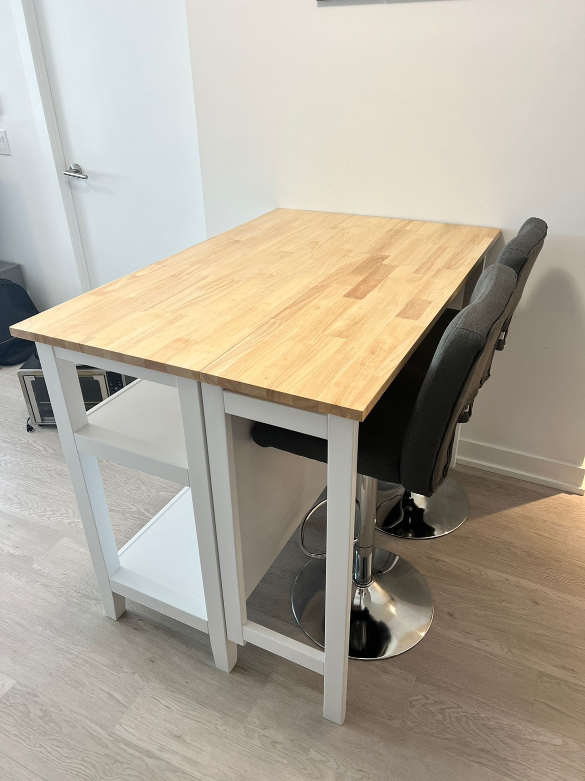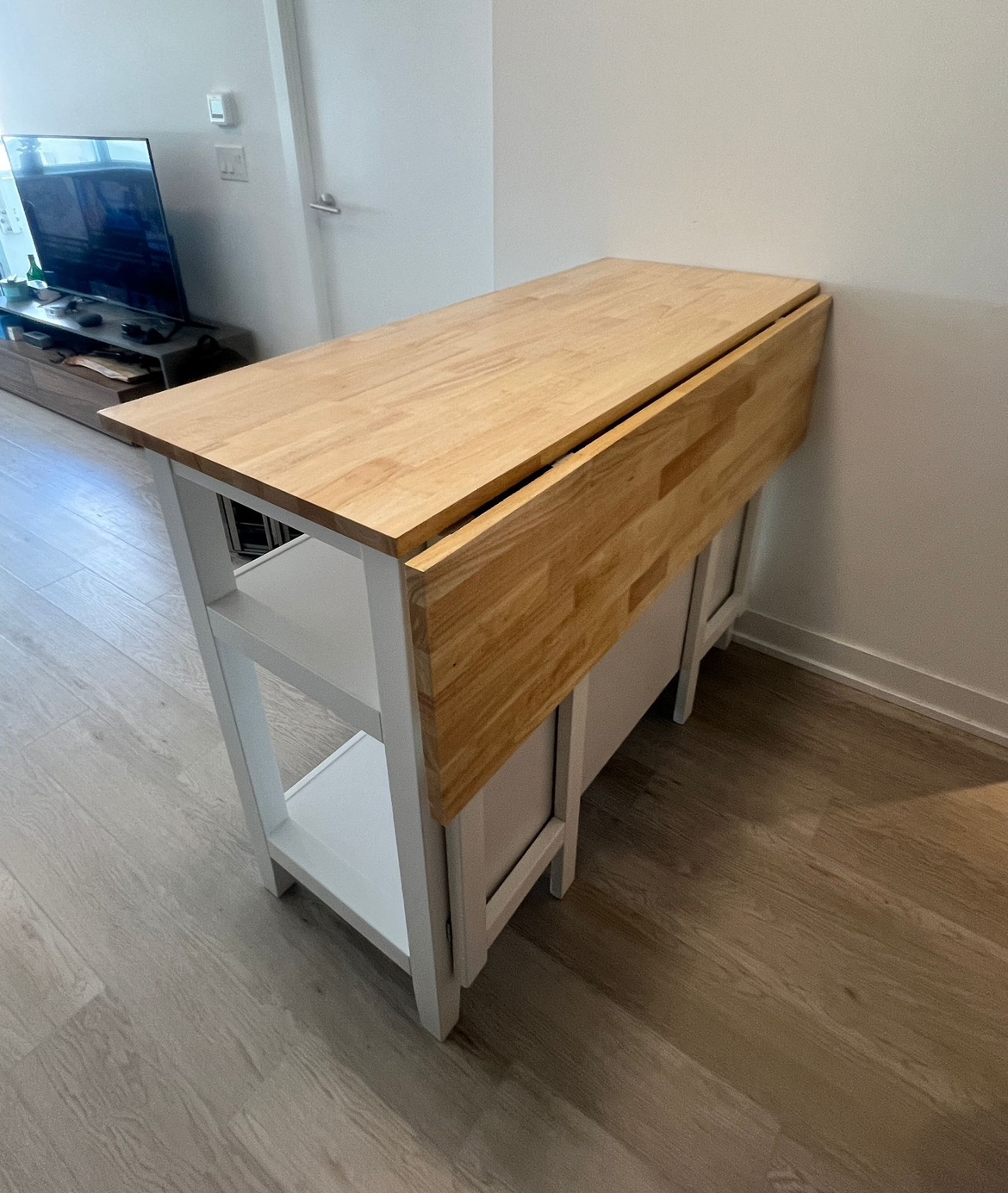 15The body of the island table is white. The top of the island counter has a foldable leaf, which allows you to expand the size for added work space while preparing meals, or even for seating if needed. Size: 91.2*143*80cm (with the leaf up) Condition: Like New (6 months) Pick up only Location: Near Yonge and Eglington