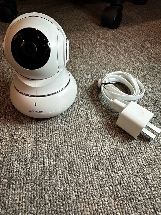 Keep an eye on things with this Litokam camera! This indoor security camera features remote pan and tilt, two-way audio, and night vision, perfect for home monitoring. Features include: Remote Pan and Tilt, Two-Way Audio, Night Vision, Motion Detection, SD Card Slot for Local Storage (SD card not included). It's in good condition and ready to use. Selling for $30.