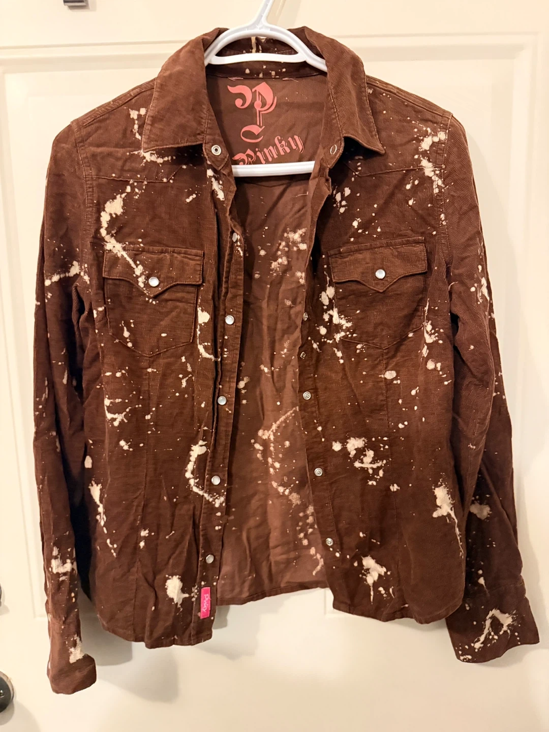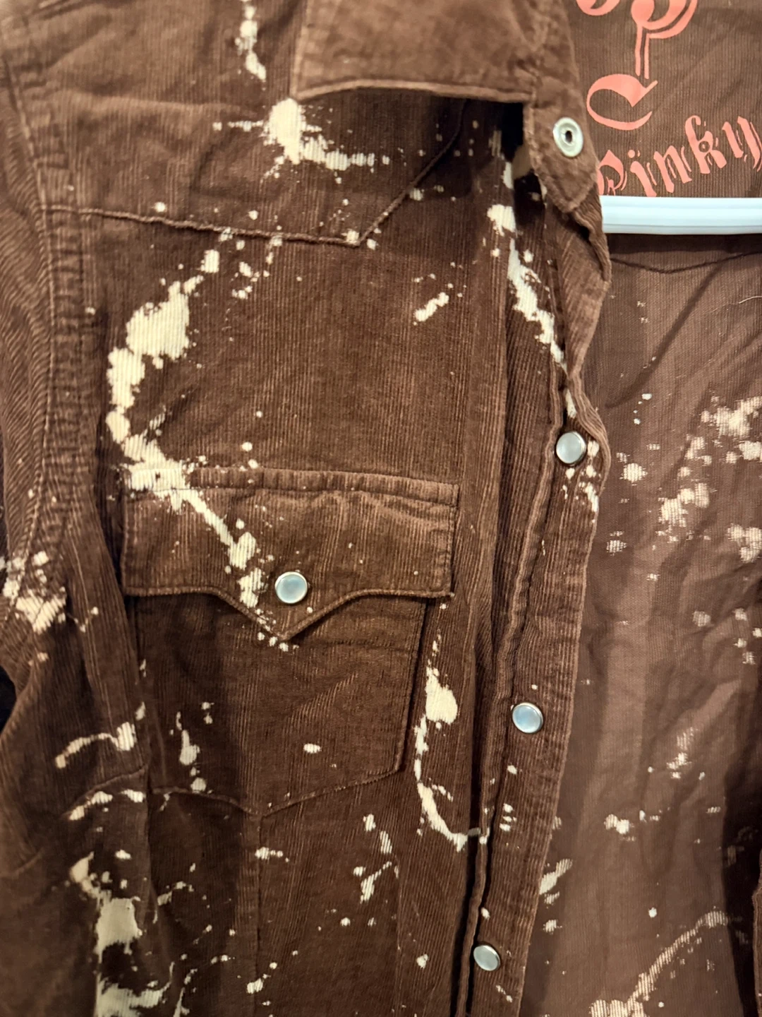 Brown corduroy shirt with a bleach-splatter design.
