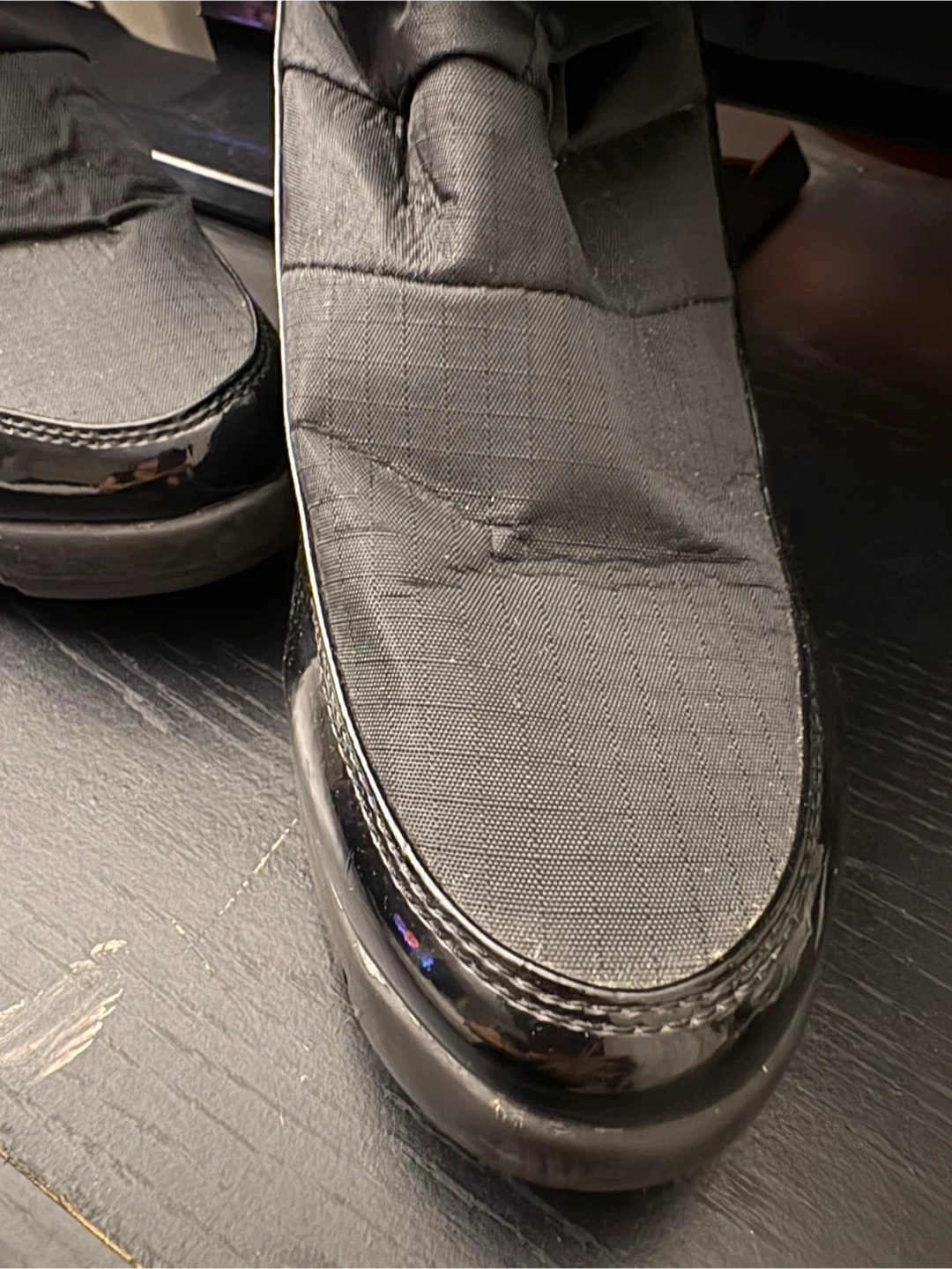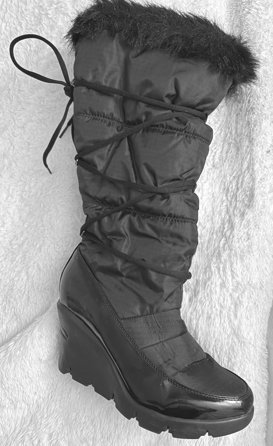 Tall black puffer boots featuring a comfortable wedge heel and cozy faux fur trim. These boots have a shiny patent toe cap and detailing, with adjustable criss-cross lacing up the back for a custom fit. They're perfect for staying warm and stylish on chilly days!