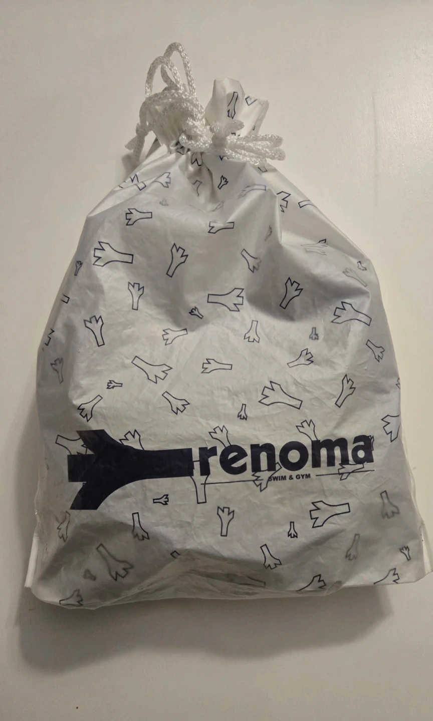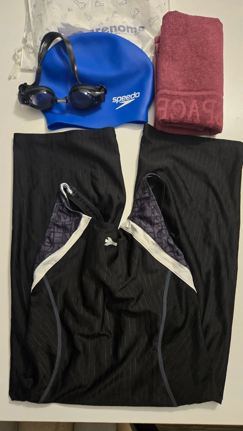 This bundle includes an Arena black swimsuit with pinstripe detailing and an Arena branded swim cap. A Speedo swim cap and goggles are also included, along with a pink towel. Comes with a Renoma drawstring bag.