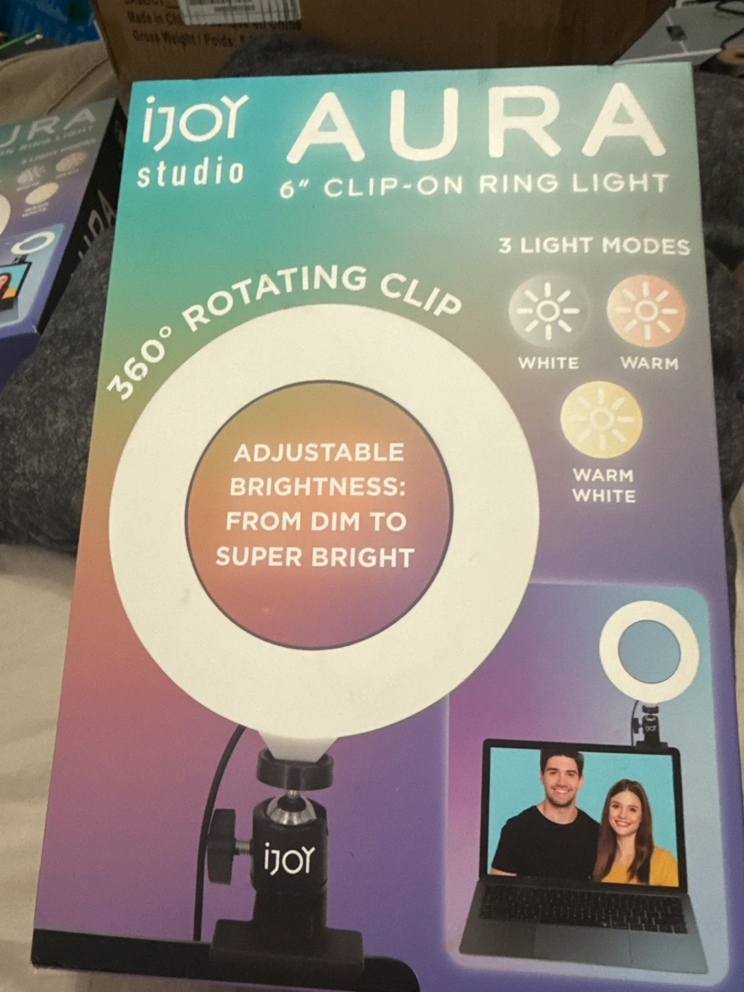 This is an iJoy Aura 6" clip-on ring light with a 360° rotating clip. It has adjustable brightness from dim to super bright and comes with 3 light modes: white, warm, and warm white. Great for video calls or content creation! I have 2