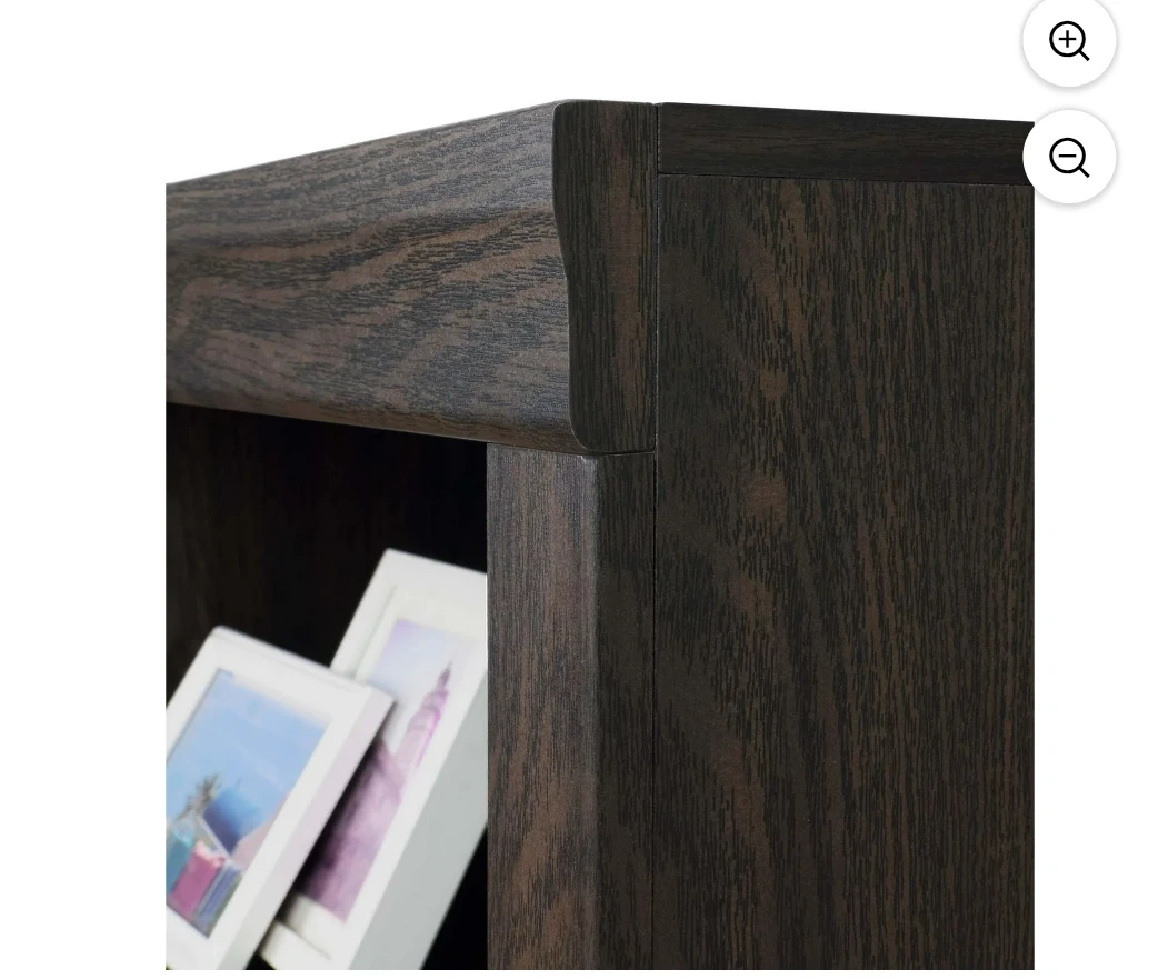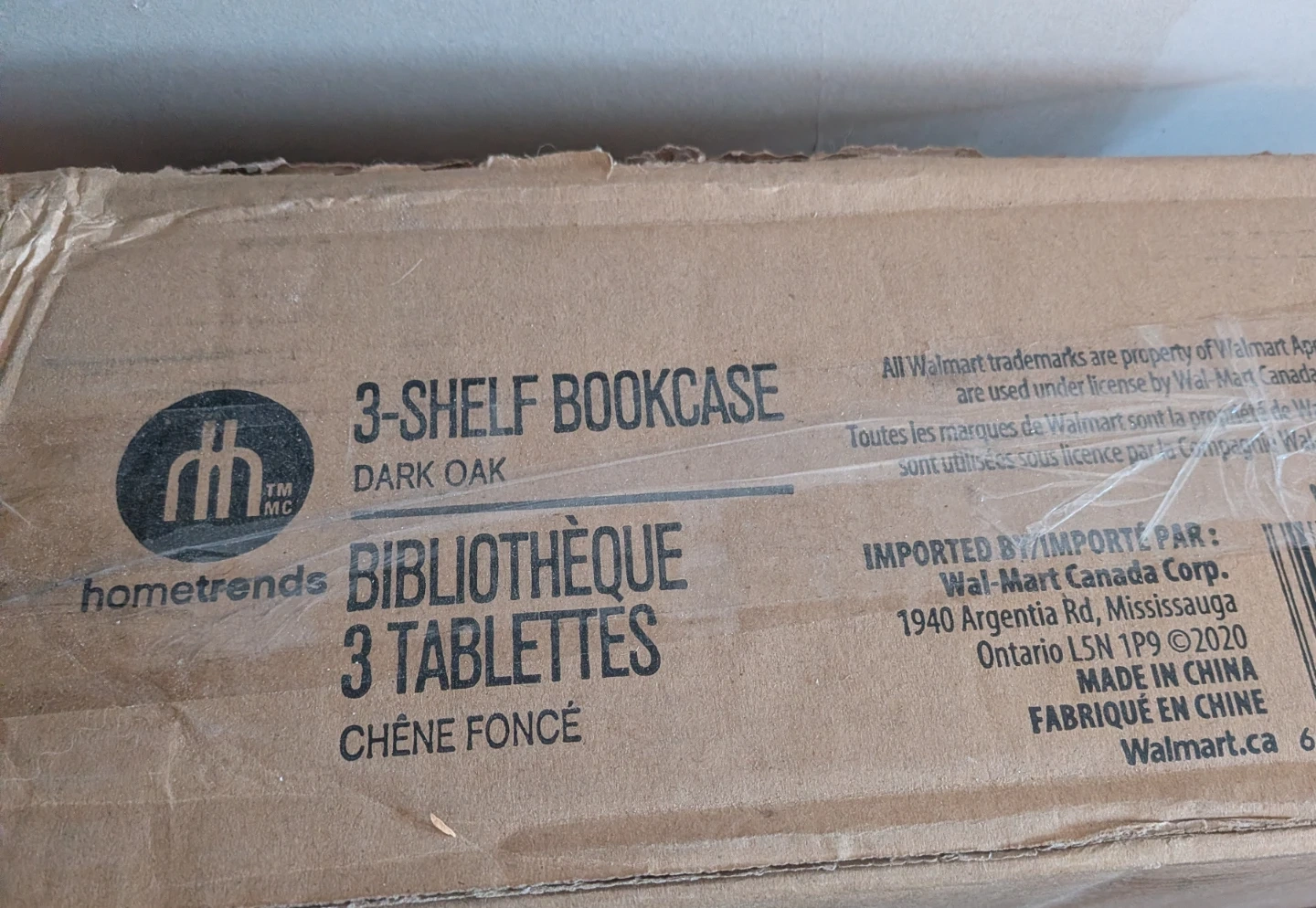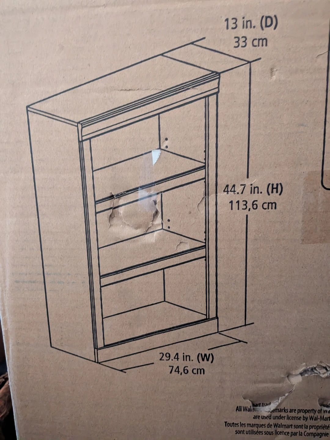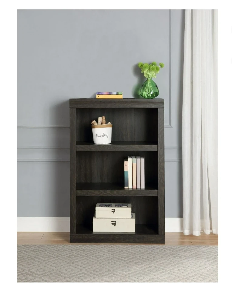This Hometrends bookcase has three shelves and a dark oak finish. It measures 44.7 inches high, 29.4 inches wide, and 13 inches deep. This unit is made in China.