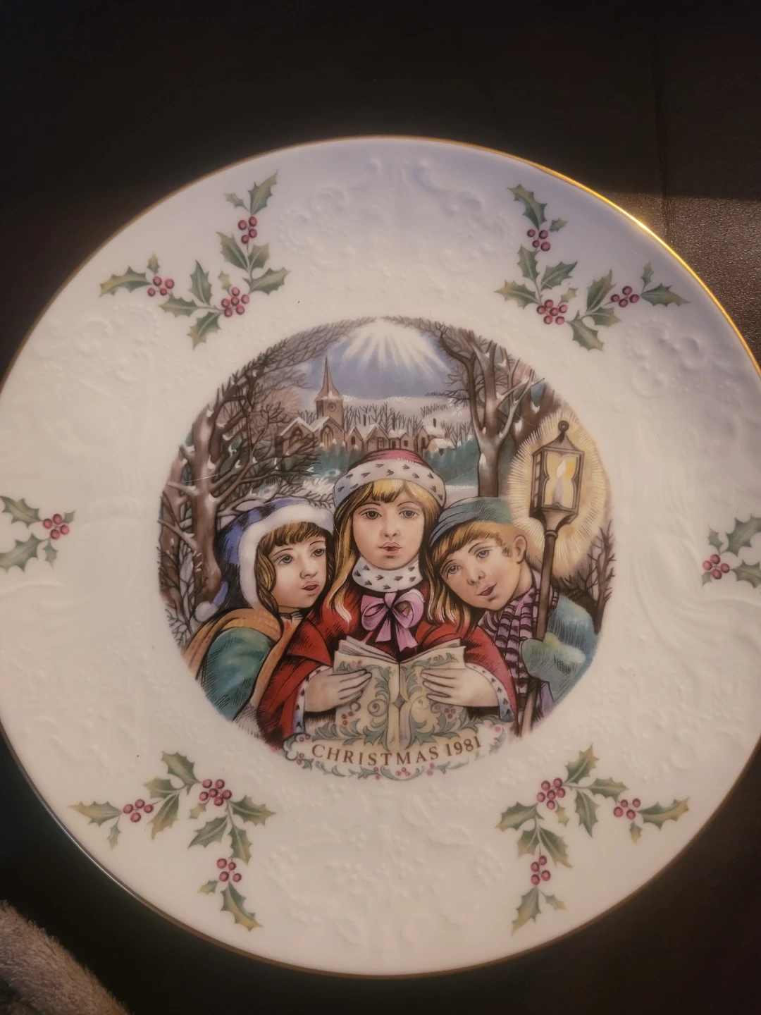Royal Doulton Christmas plate, fifth in a series from 1981. Features a festive scene with carolers and holiday text. Ceramic construction with a gold rim.