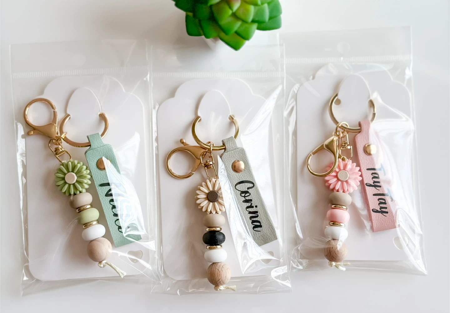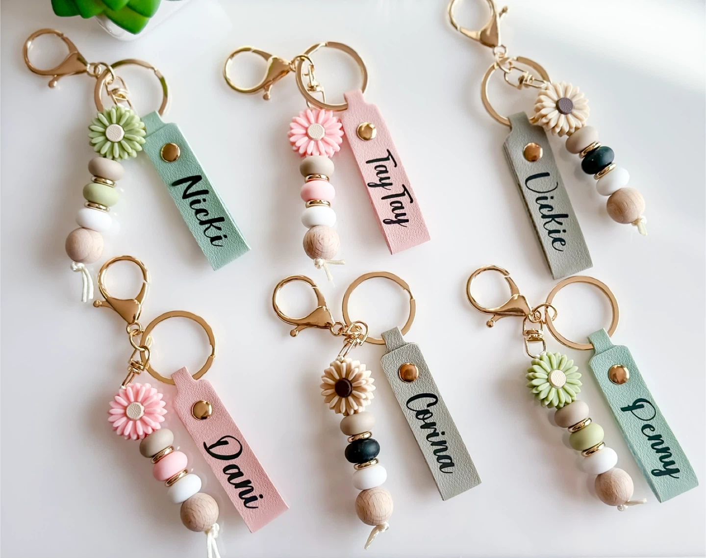 Personalized Daisy Beaded Keychain with colorful silicone beads, an adorable flower charm, and a soft faux leather strap — all personalized with a name.
