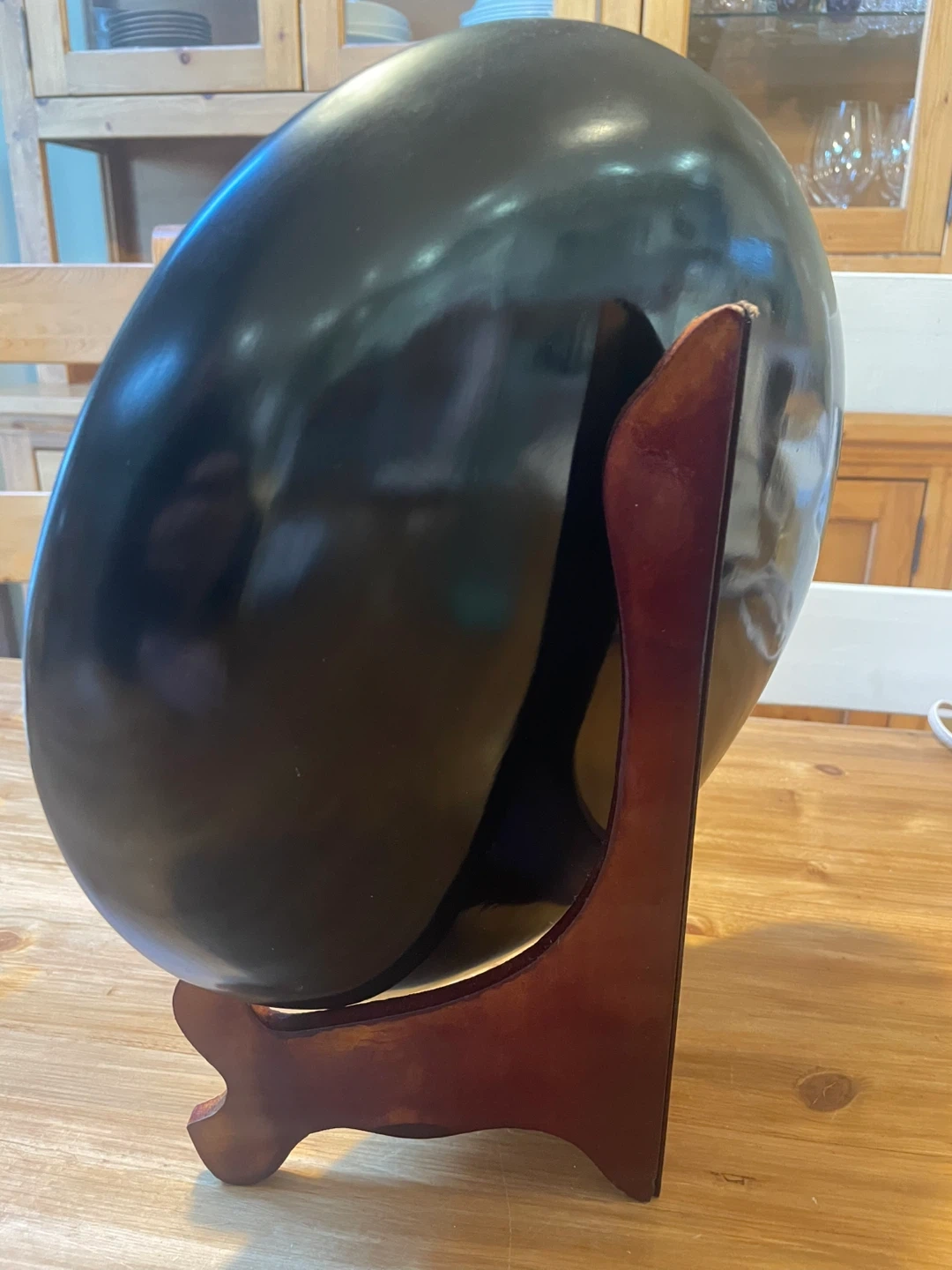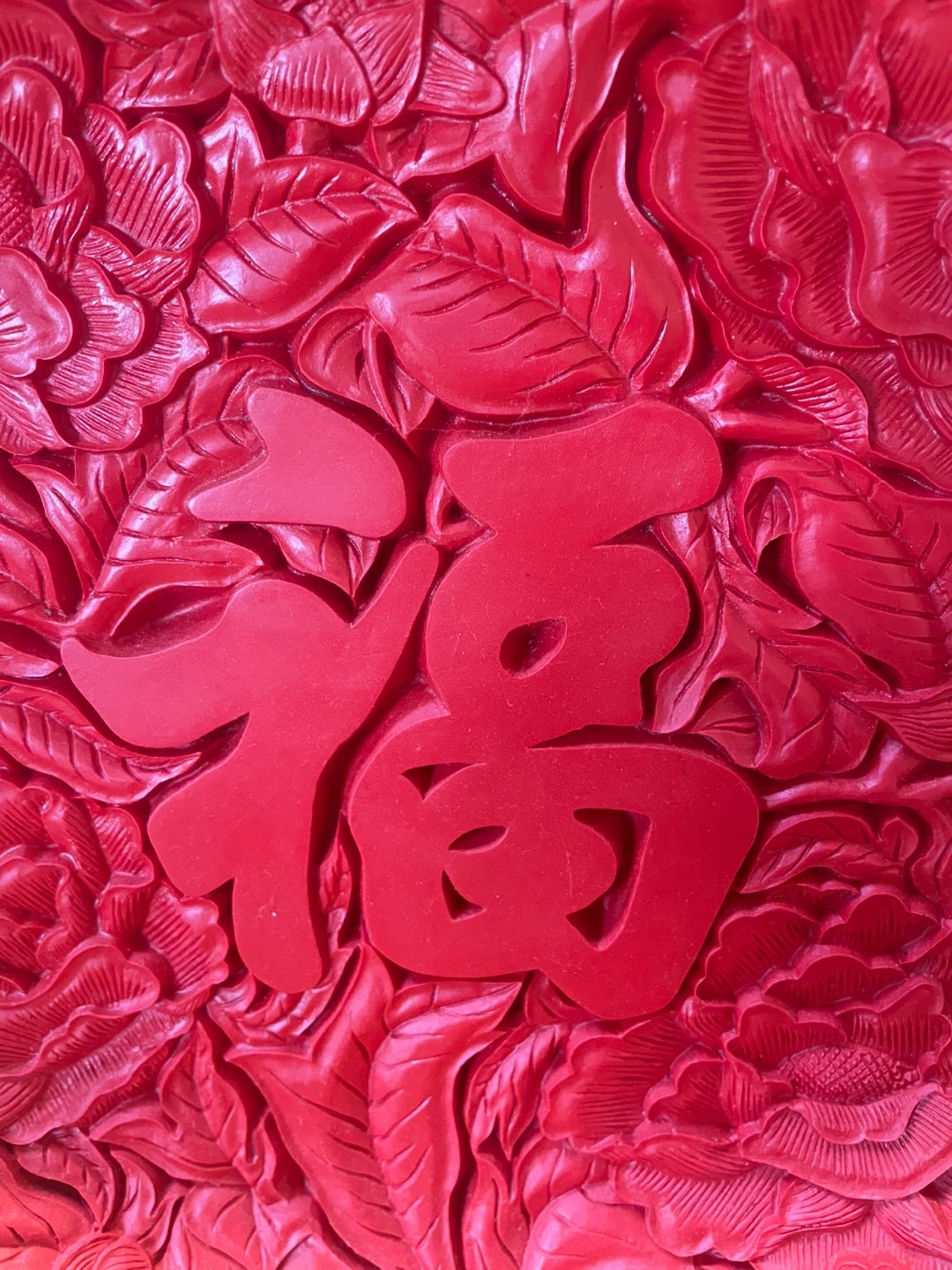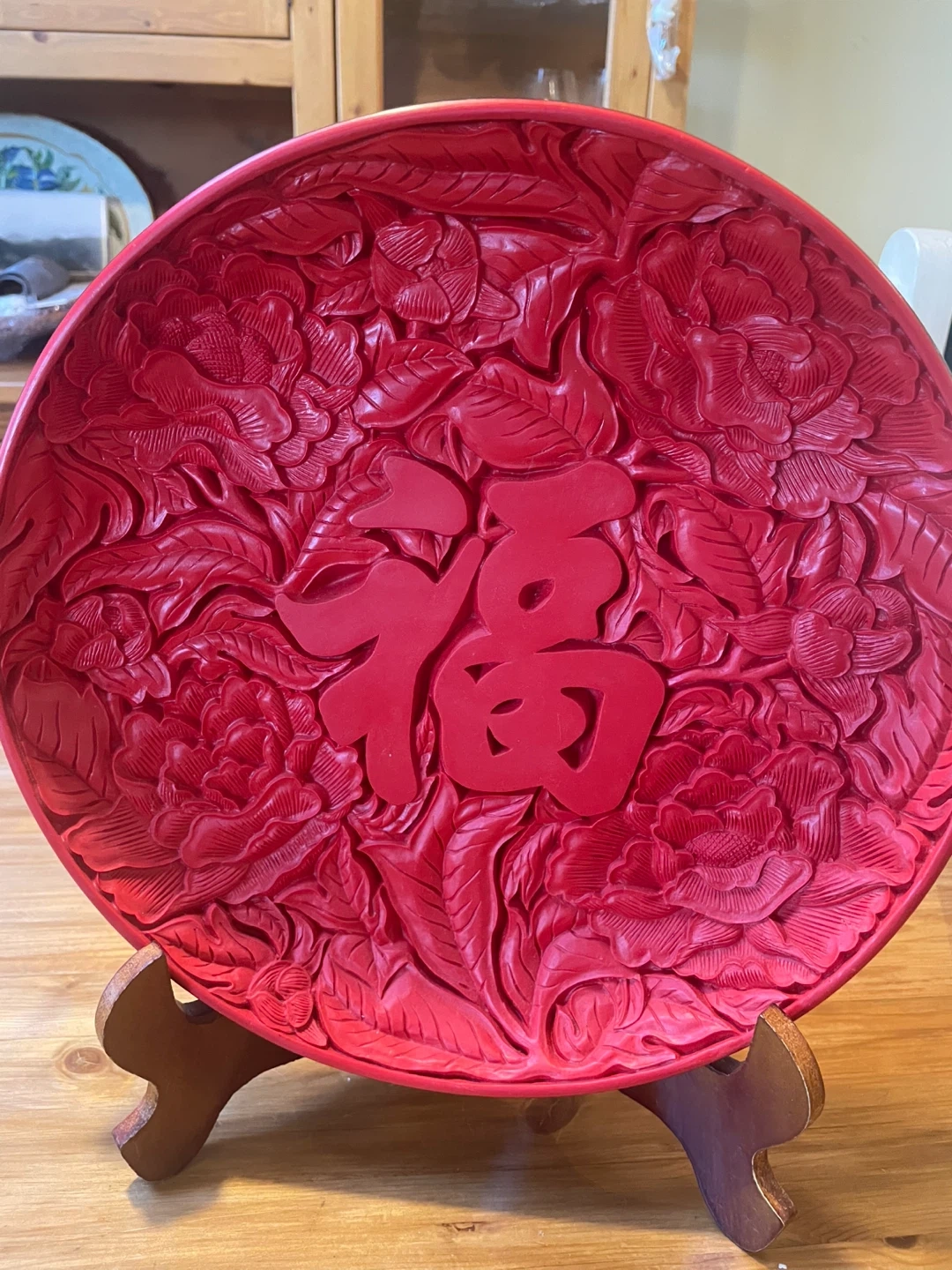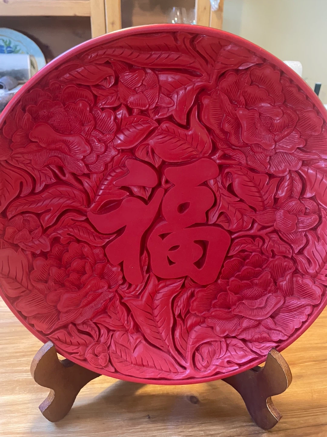 Decorative red plate with intricate floral and leaf carvings. Features a central Chinese character "Fu" (福), symbolizing good fortune. It's approximately 10 inches in diameter and comes with a wooden display stand. This piece is great for adding a touch of cultural decor to any room!