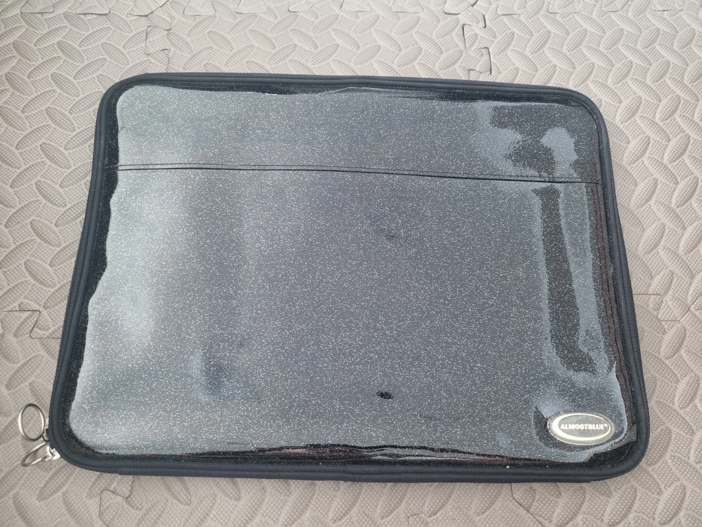 This is an ALMOSTBLUE tablet pouch in black with a glitter finish. It features a zippered closure for security. The interior has mesh pockets and elastic straps for organization.