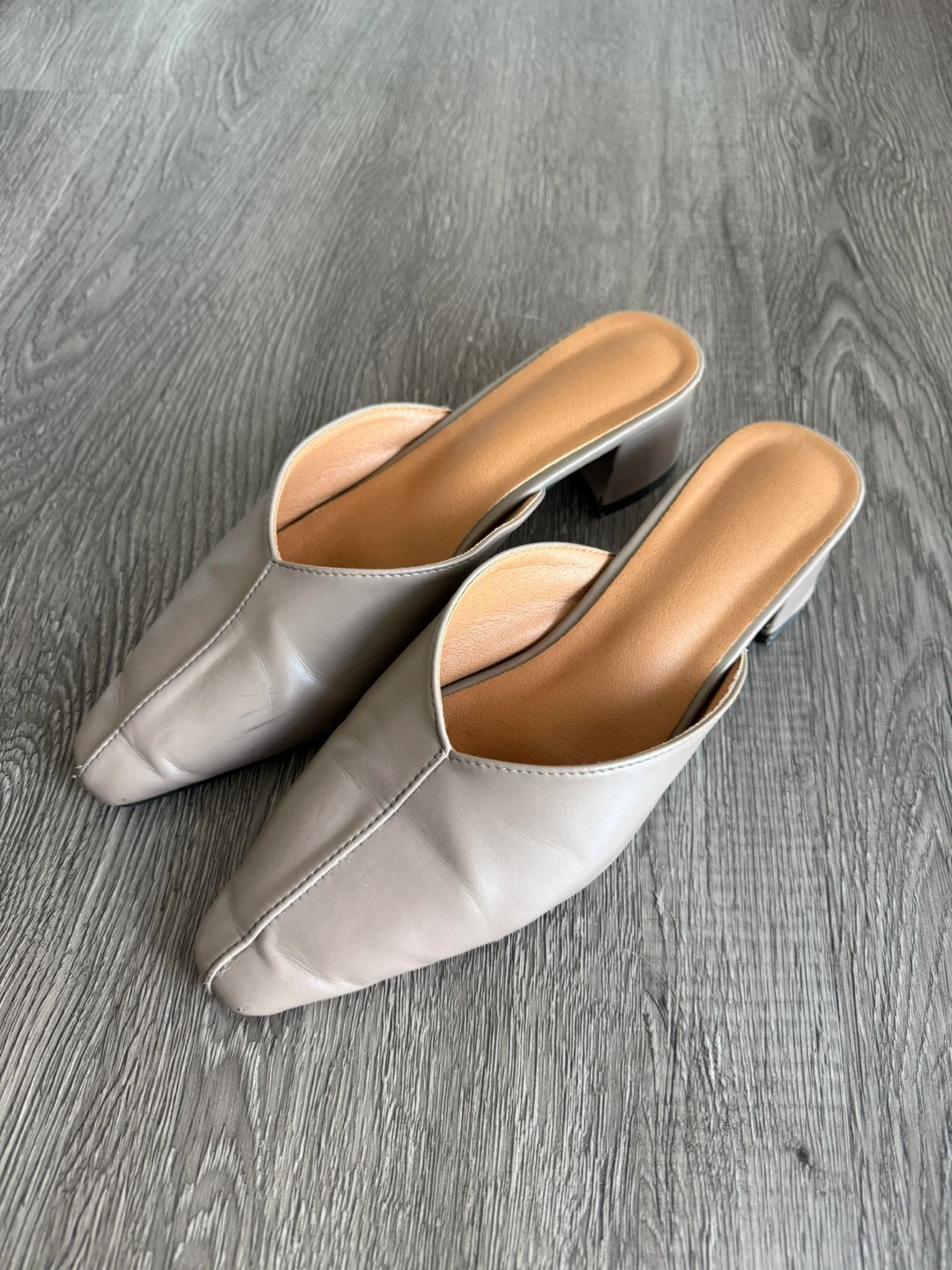 Pointed toe mule slides in a neutral taupe colour. These feature a low block heel for comfortable wear. Perfect for casual or dressy occasions!
