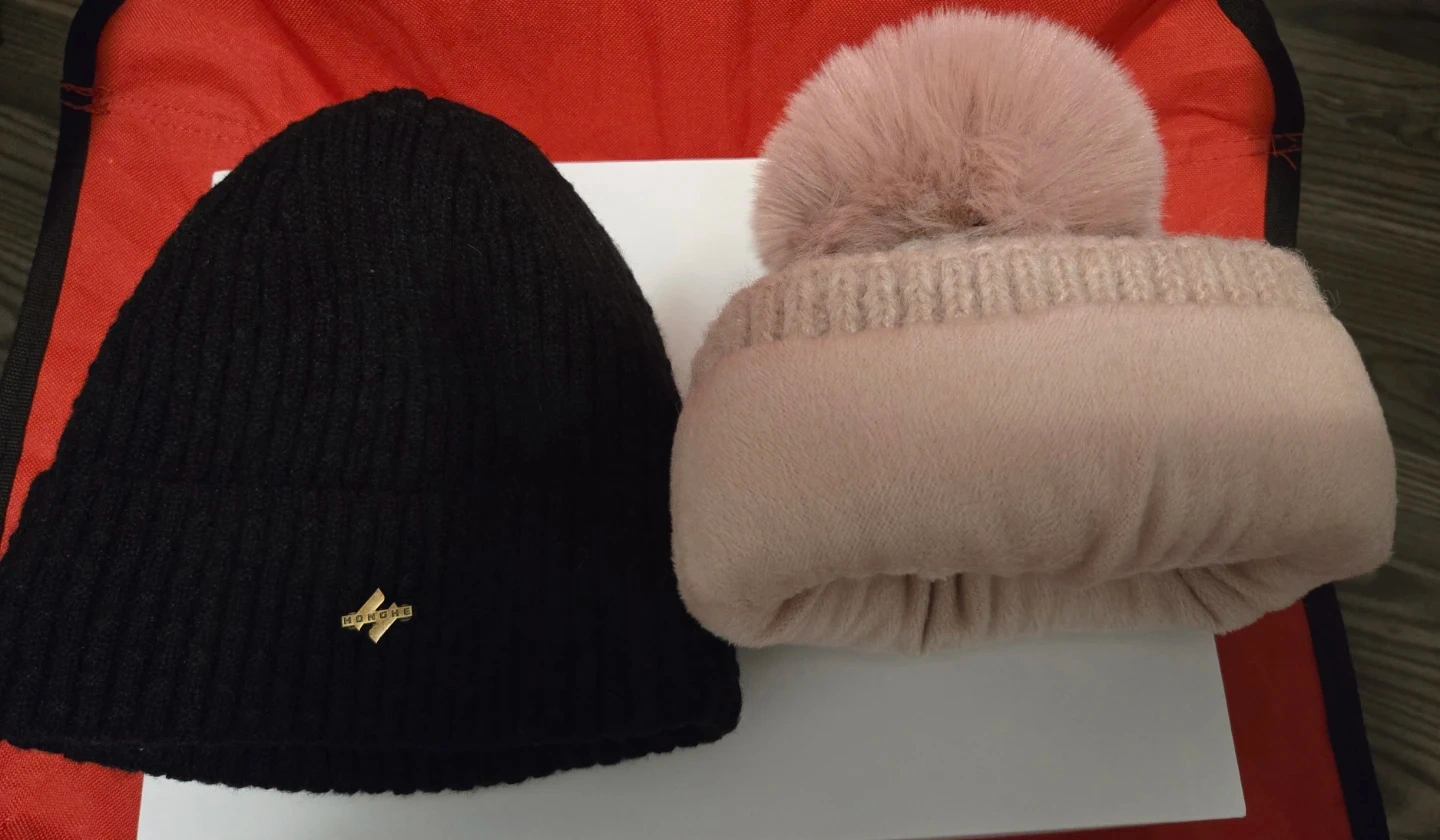 Two Knit Beanies: Honghe Black & Pink Pom Pom