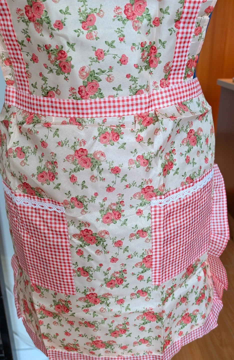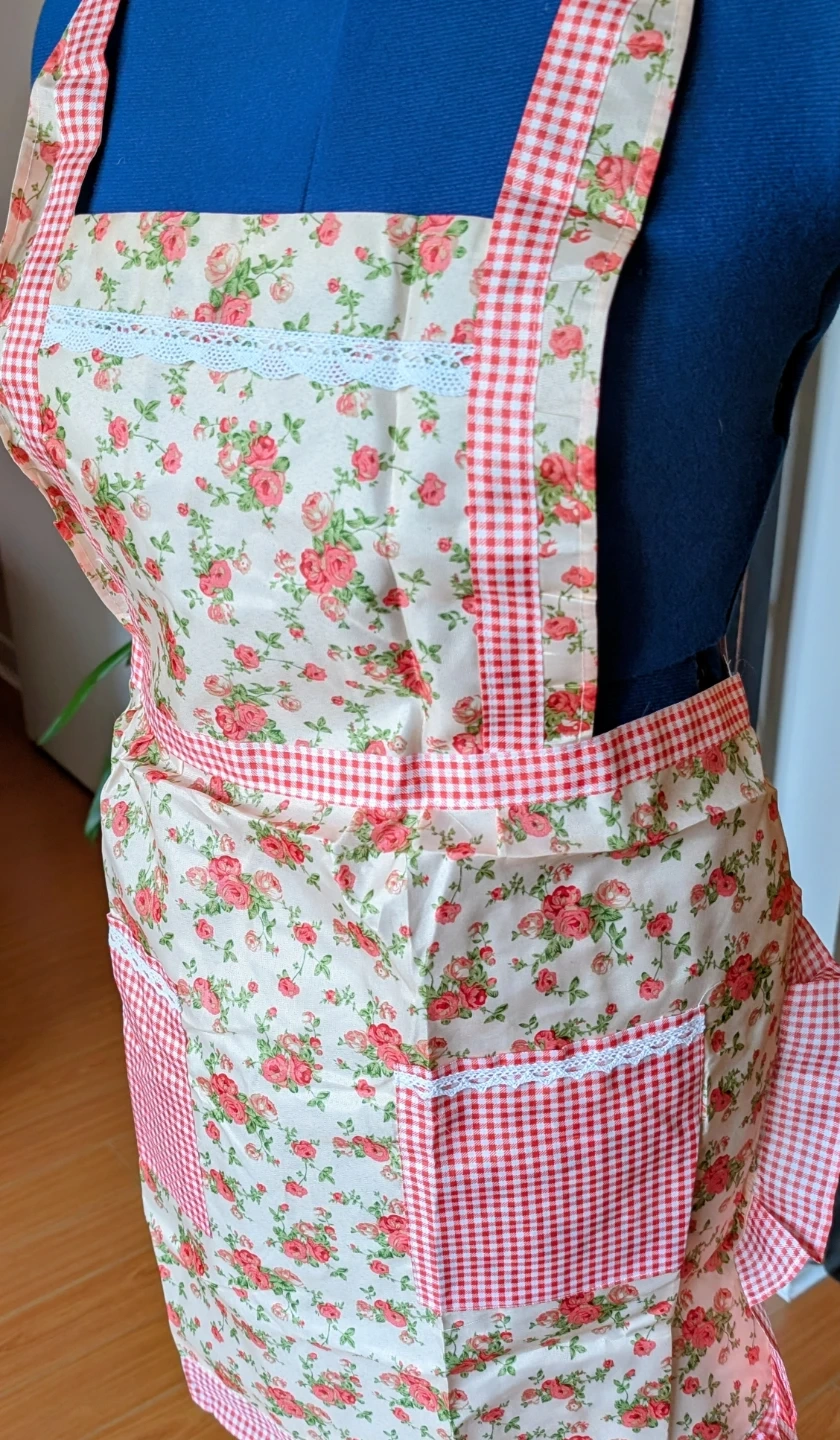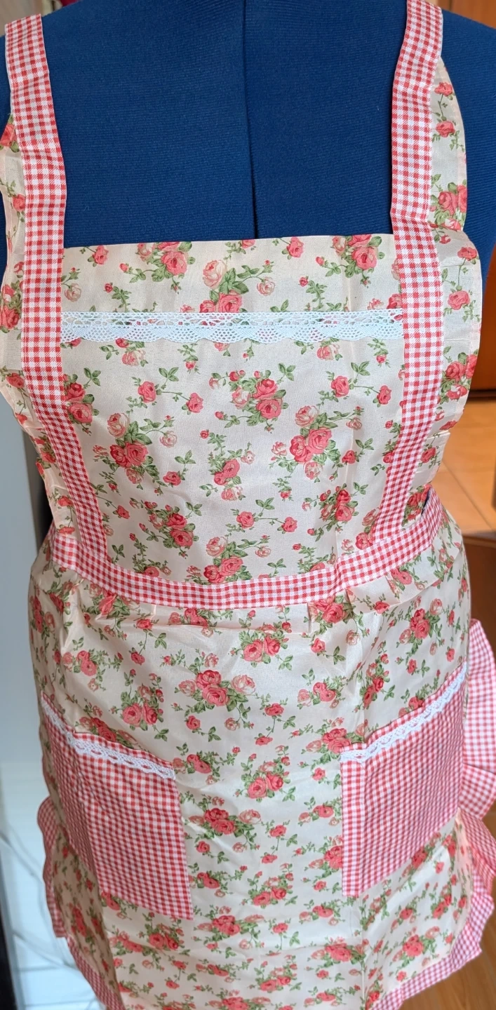 This is a lovely floral print apron. It has a creamy background with pink roses all over. It features two red gingham pockets at the front, accented with white lace trim. Ties at the waist and adjustable shoulder straps ensure a comfortable fit.